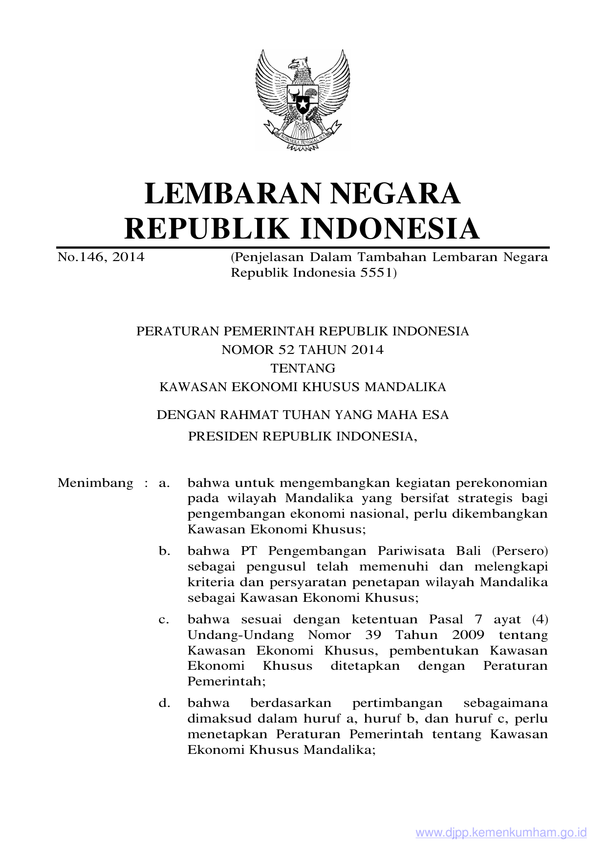 PP Nomor 52 Tahun 2014 | Peraturan Pemerintah Nomor 52 Tahun 2014 tentang KAWASAN EKONOMI KHUSUS MANDALIKA