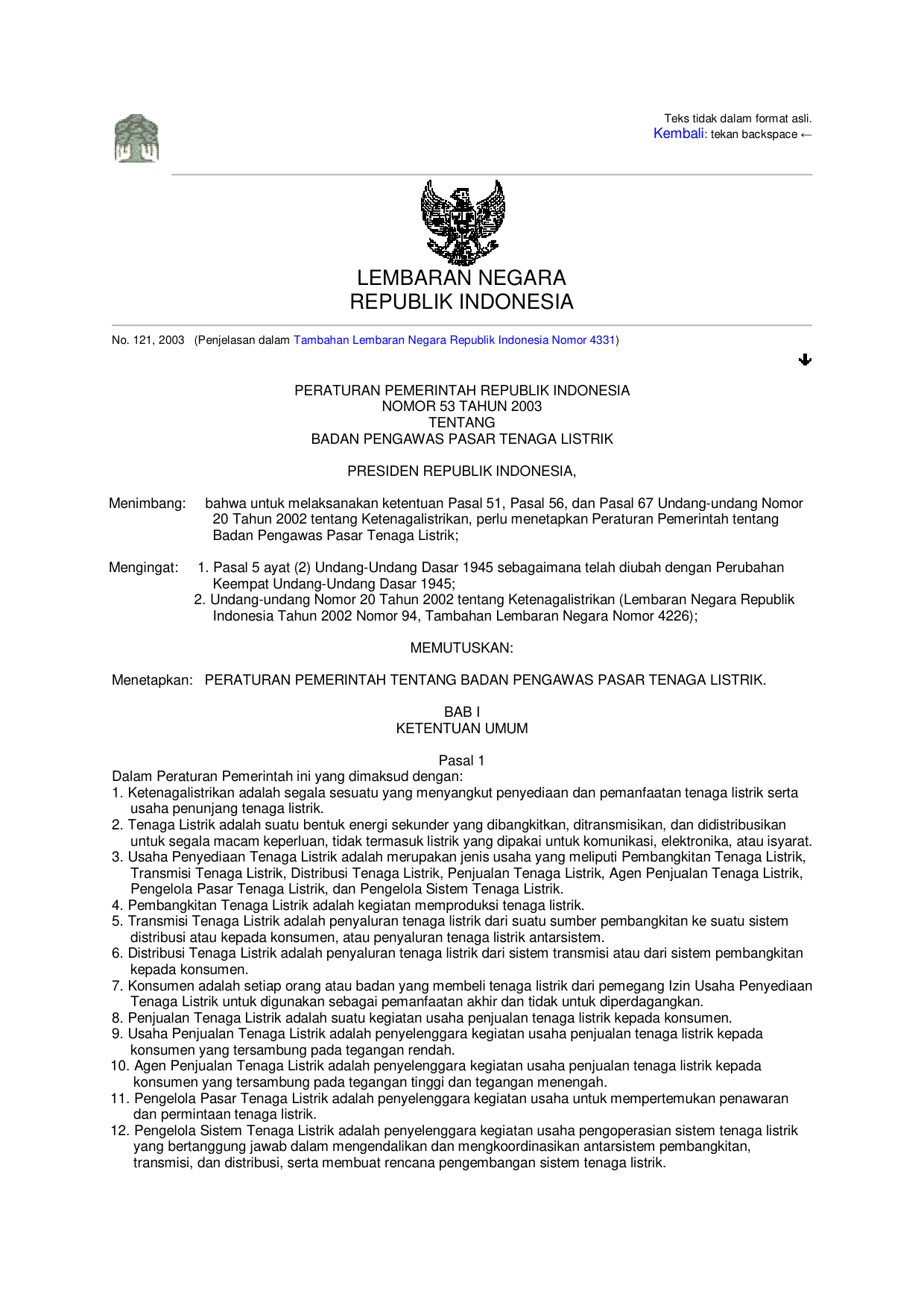 PP Nomor 53 Tahun 2003 | Peraturan Pemerintah Nomor 53 Tahun 2003 tentang BADAN PENGAWAS PASAR TENAGA LISTRIK