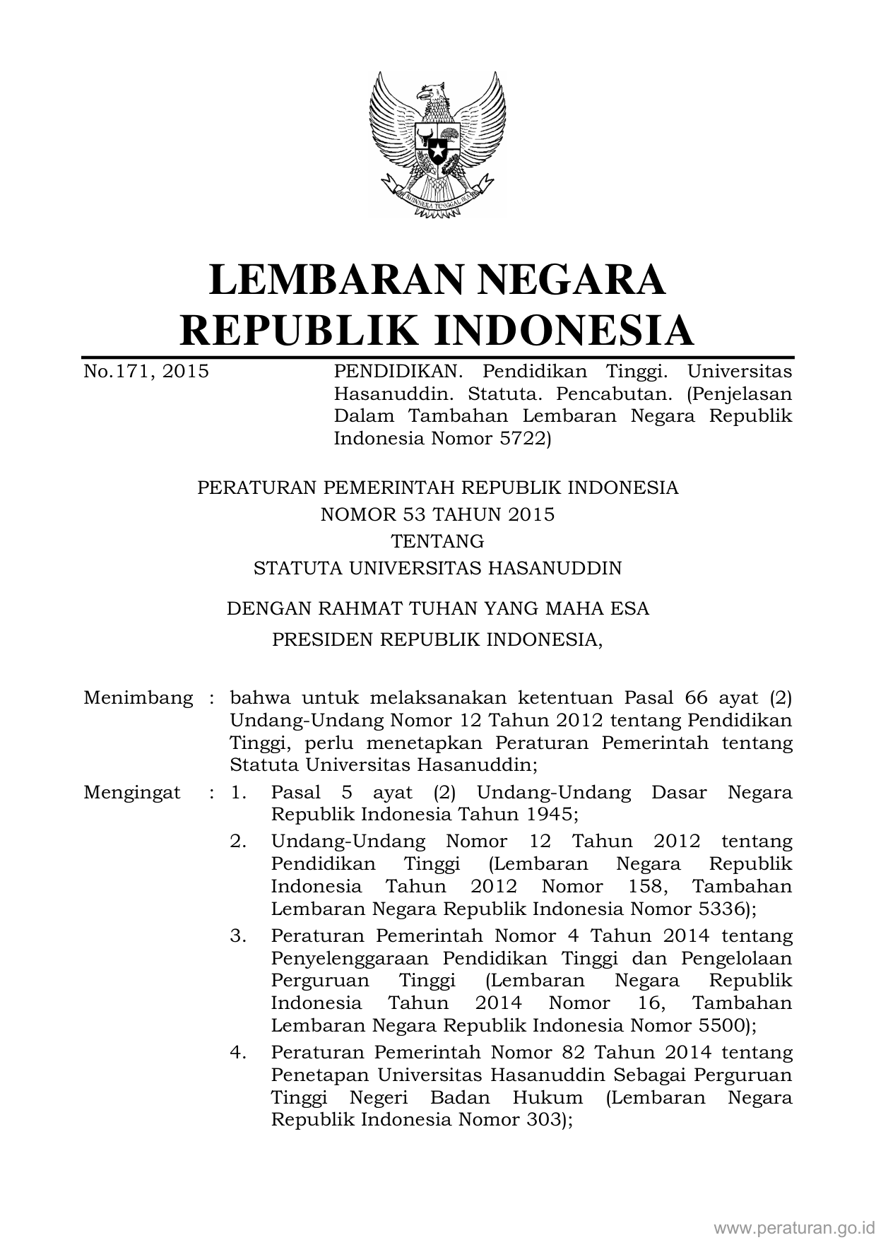 PP Nomor 53 Tahun 2015 | Peraturan Pemerintah Nomor 53 Tahun 2015 tentang STATUTA UNIVERSITAS HASANUDDIN