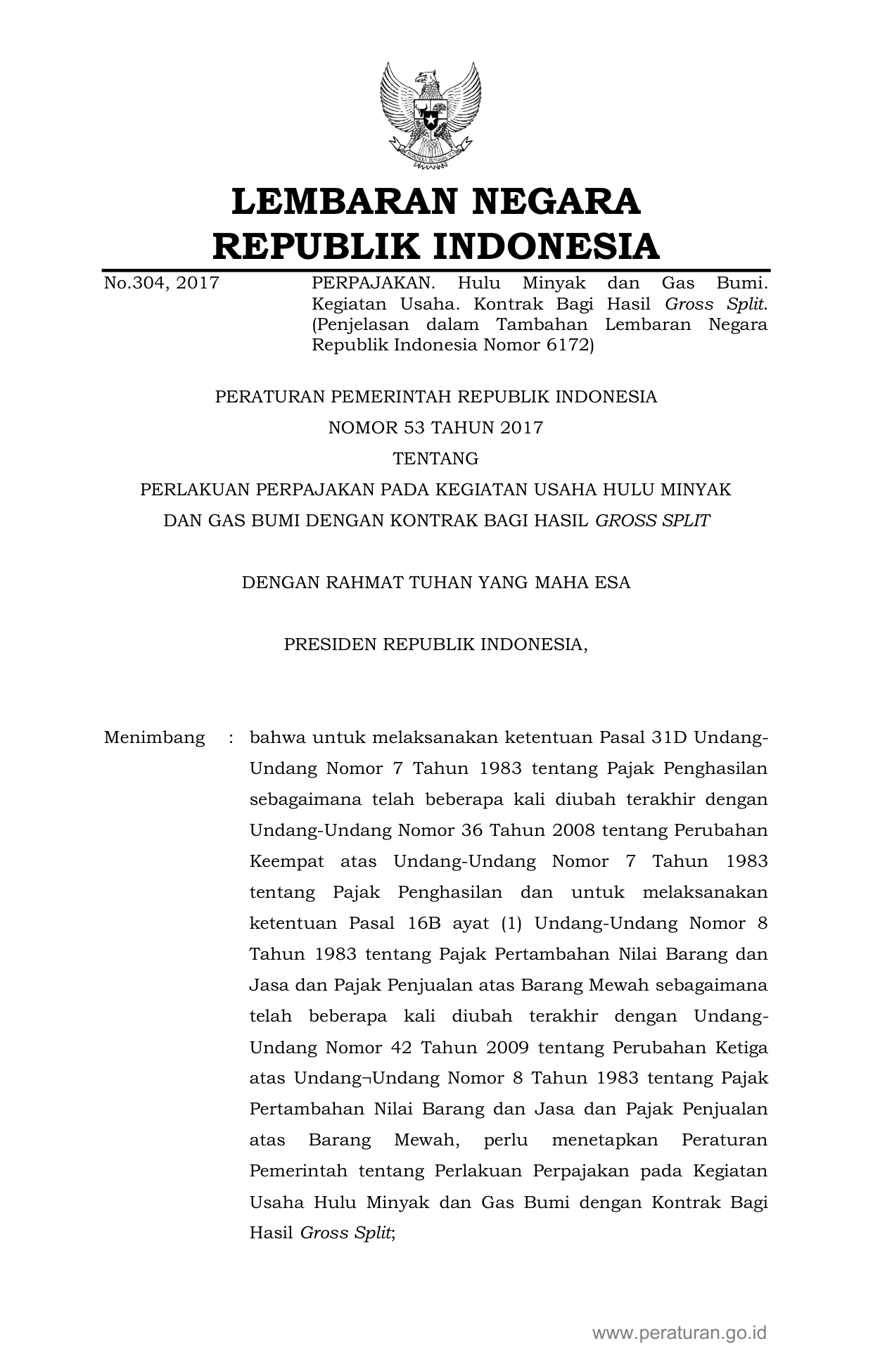 PP Nomor 53 Tahun 2017 | Peraturan Pemerintah Nomor 53 Tahun 2017 tentang Perlakuan Perpajakan Pada Kegiatan Usaha Hulu Minyak dan Gas Bumi Dengan Kontrak Bagi Hasil Gross Split