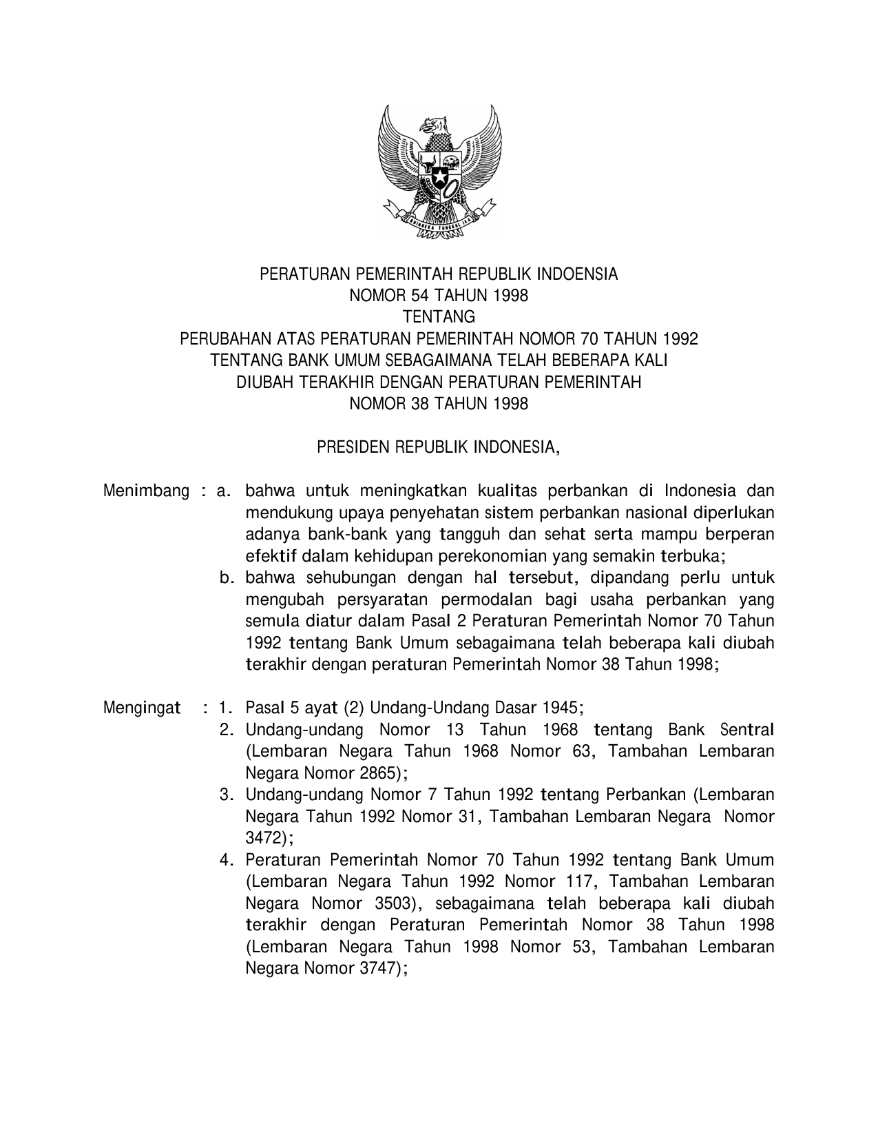 PP Nomor 54 Tahun 1998 | Peraturan Pemerintah Nomor 54 Tahun 1998 tentang PERUBAHAN PP 70-1992 TENTANG BANK UMUM SEBAGAIMANA TELAH BEBERAPA KALI DIUBAH TERAKHIR DENGAN PP 38-1998