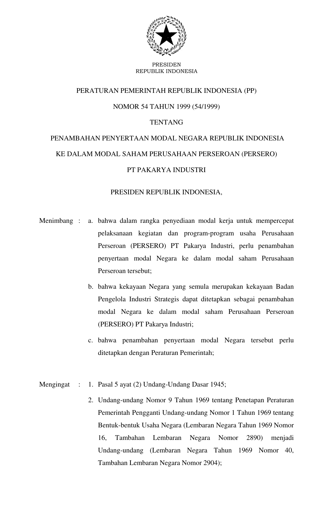 PP Nomor 54 Tahun 1999 | Peraturan Pemerintah Nomor 54 Tahun 1999 tentang PENAMBAHAN PENYERTAAN MODAL NEGARA RI KE DALAM MODAL SAHAM PERUSAHAAN PERSEROAN (PERSERO) PT PAKARYA INDUSTRI