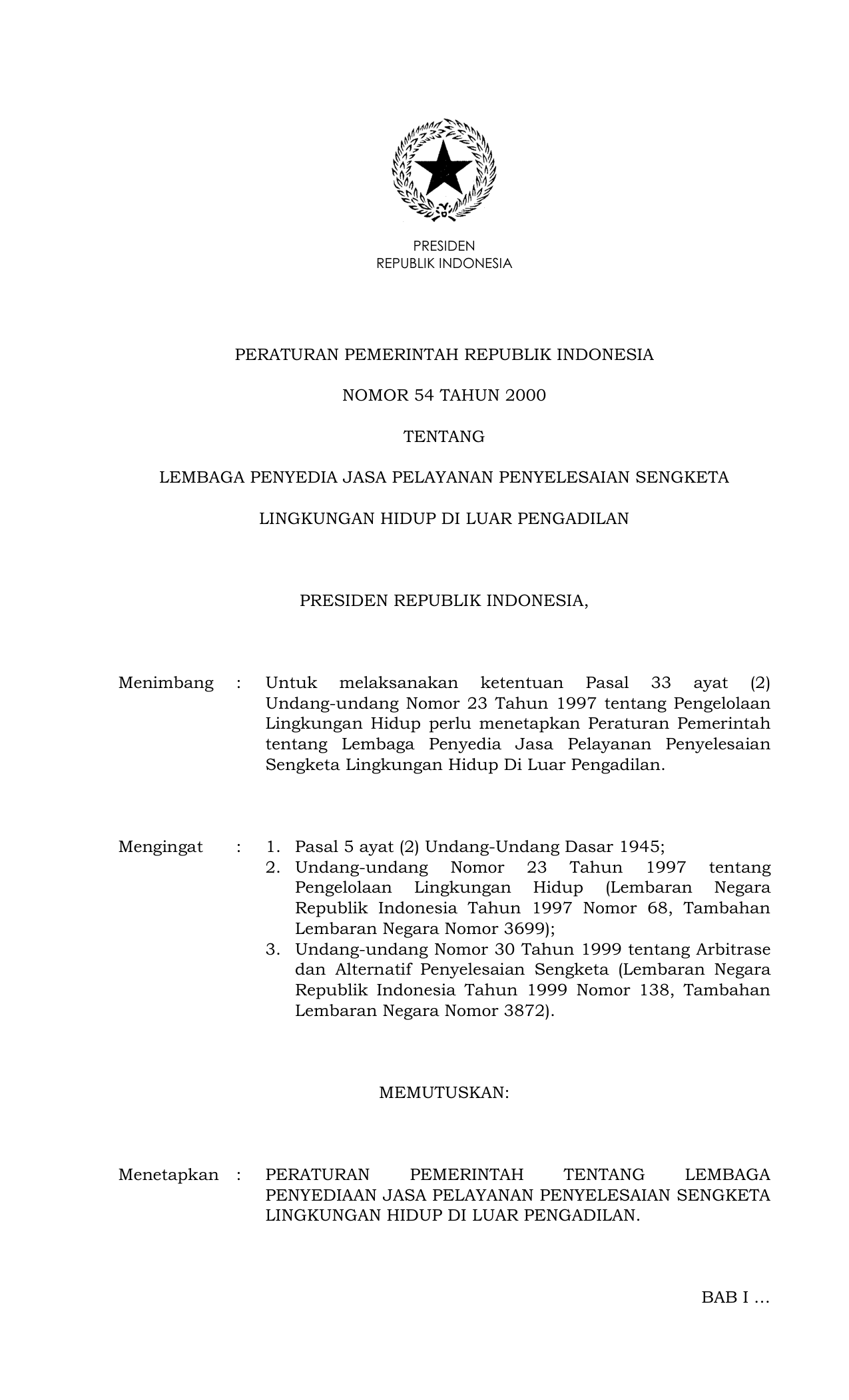 PP Nomor 54 Tahun 2000 | Peraturan Pemerintah Nomor 54 Tahun 2000 tentang LEMBAGA PENYEDIA JASA PELAYANAN PENYELESAIAN SENGKETA LINGKUNGAN HIDUP DI LUAR PENGADILAN