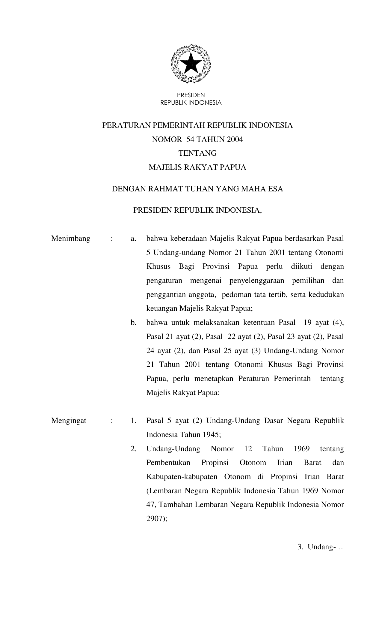 PP Nomor 54 Tahun 2004 | Peraturan Pemerintah Nomor 54 Tahun 2004 tentang MAJELIS RAKYAT PAPUA