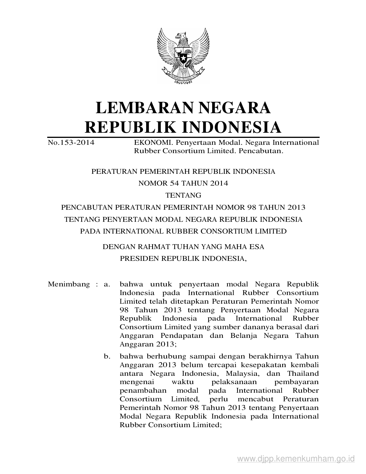 PP Nomor 54 Tahun 2014 | Peraturan Pemerintah Nomor 54 Tahun 2014 tentang PENCABUTAN PERATURAN PEMERINTAH NOMOR 98 TAHUN 2013 TENTANG PENYERTAAN MODAL NEGARA REPUBLIK INDONESIA PADA INTERNATIONAL RUBBER CONSORTIUM LIMITED