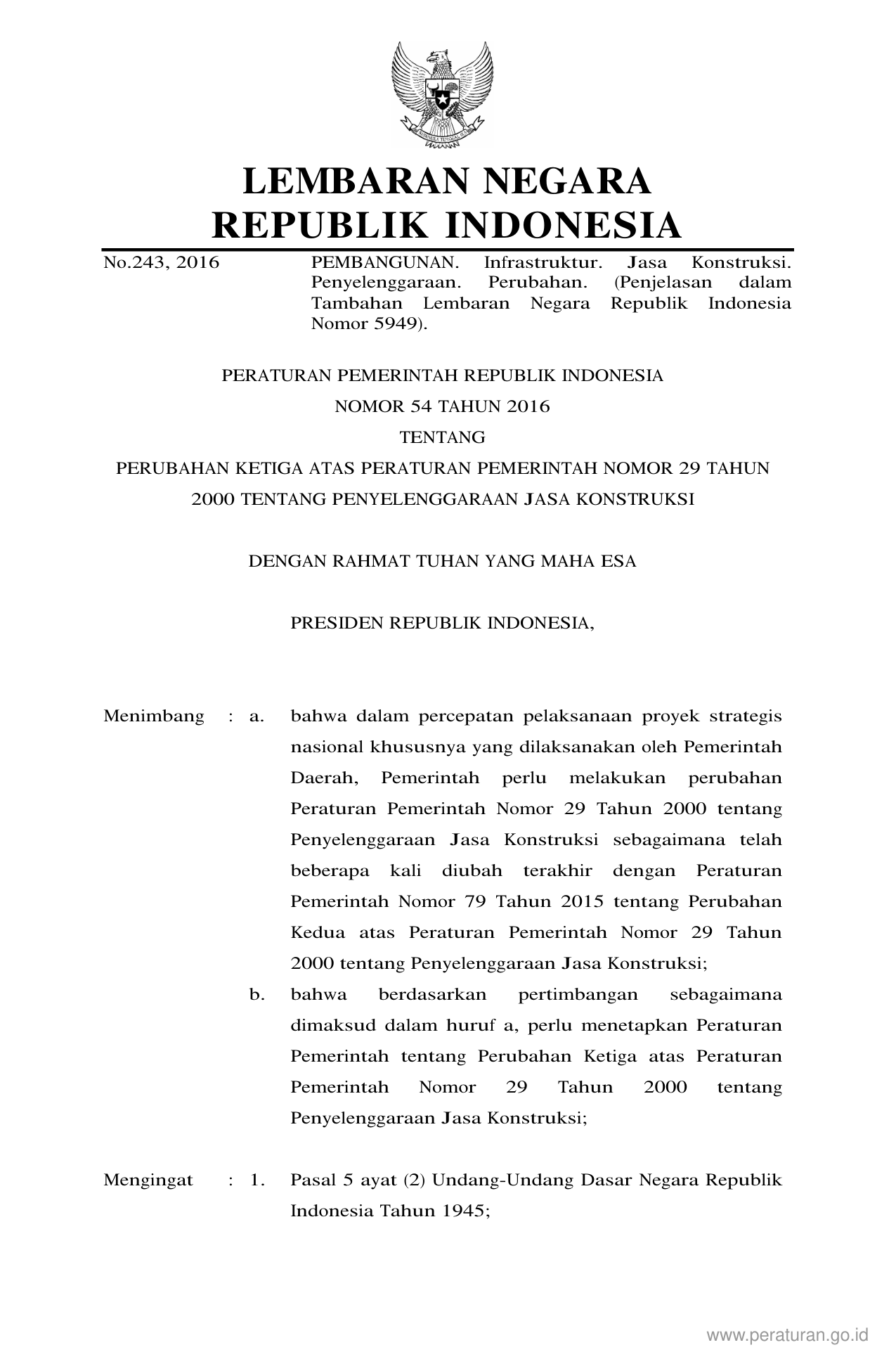 PP Nomor 54 Tahun 2016 | Peraturan Pemerintah Nomor 54 Tahun 2016 tentang Perubahan Ketiga Atas Peraturan Pemerintah Nomor 29 Tahun 2000 Tentang Penyelenggaraan Jasa Konstruksi