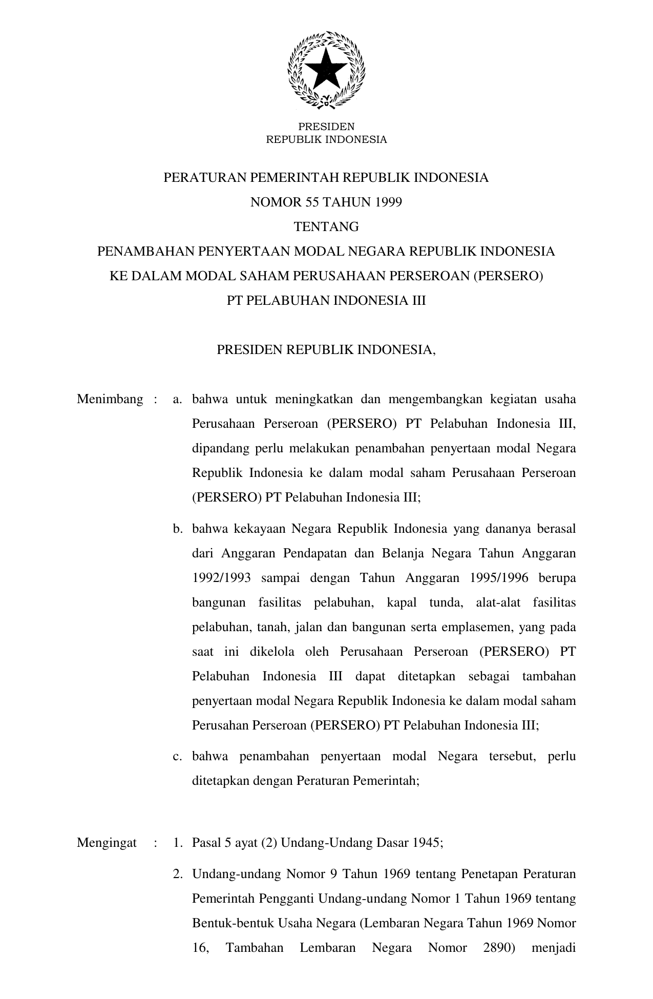 PP Nomor 55 Tahun 1999 | Peraturan Pemerintah Nomor 55 Tahun 1999 tentang PENAMBAHAN PENYERTAAN MODAL NEGARA RI KE DALAM MODAL SAHAM PERUSAHAAN PERSEROAN (PERSERO) PT PELABUHAN INDONESIA III