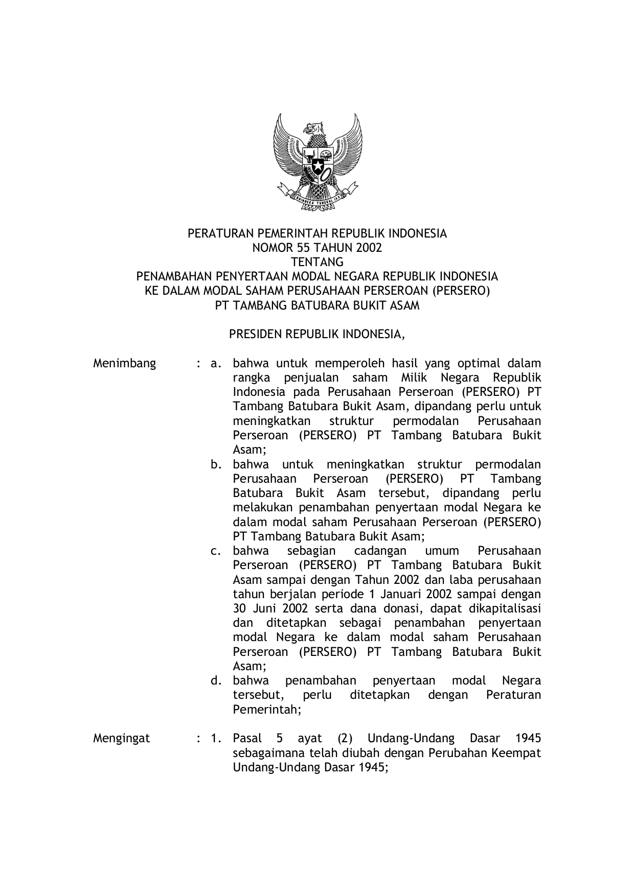 PP Nomor 55 Tahun 2002 | Peraturan Pemerintah Nomor 55 Tahun 2002 tentang PENAMBAHAN PENYERTAAN MODAL NEGARA RI KE DALAM MODAL SAHAM PERUSAHAAN PERSEROAN (PERSERO) PT TAMBANG BATUBARA BUKIT ASAM