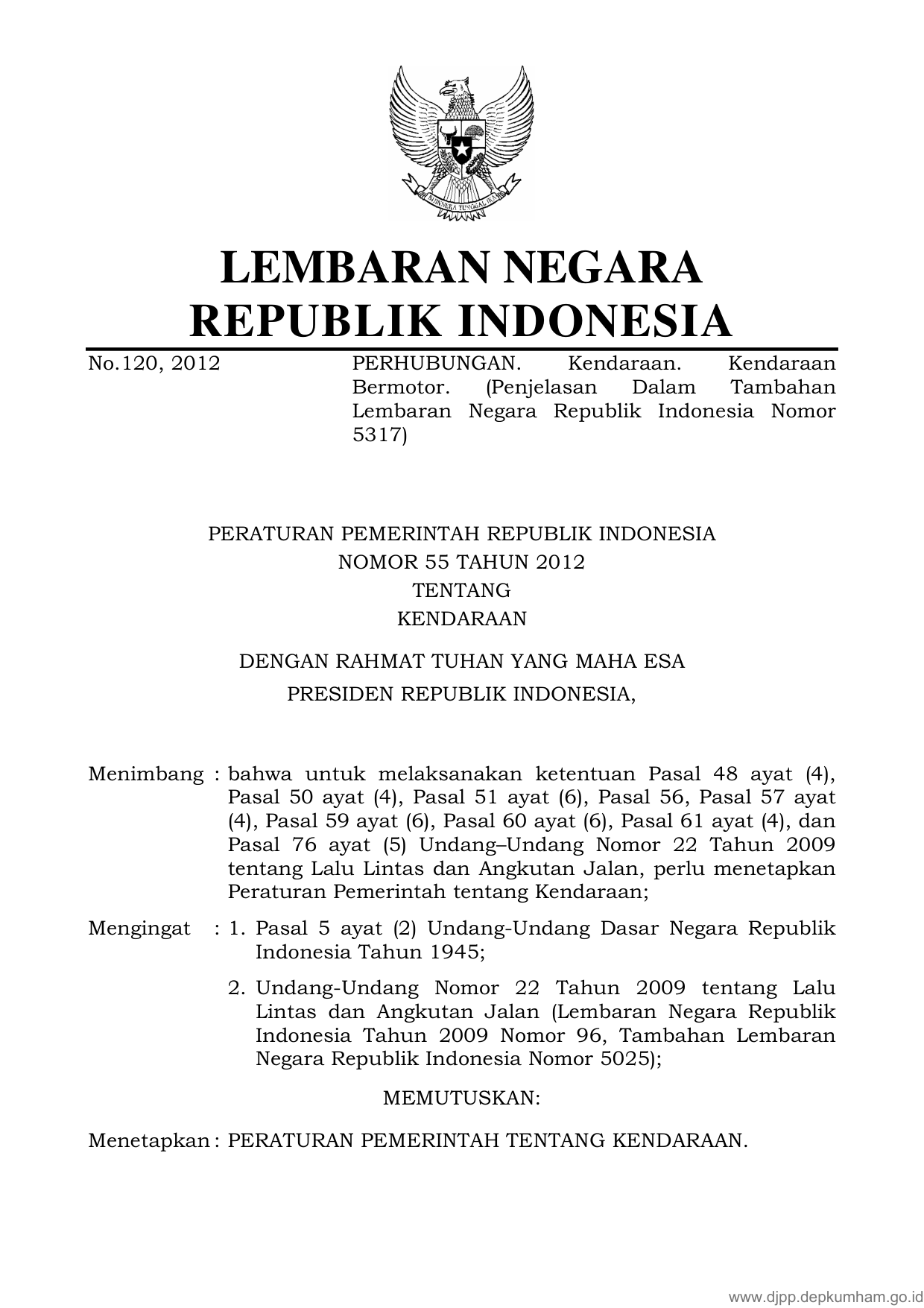 PP Nomor 55 Tahun 2012 | Peraturan Pemerintah Nomor 55 Tahun 2012 tentang KENDARAAN