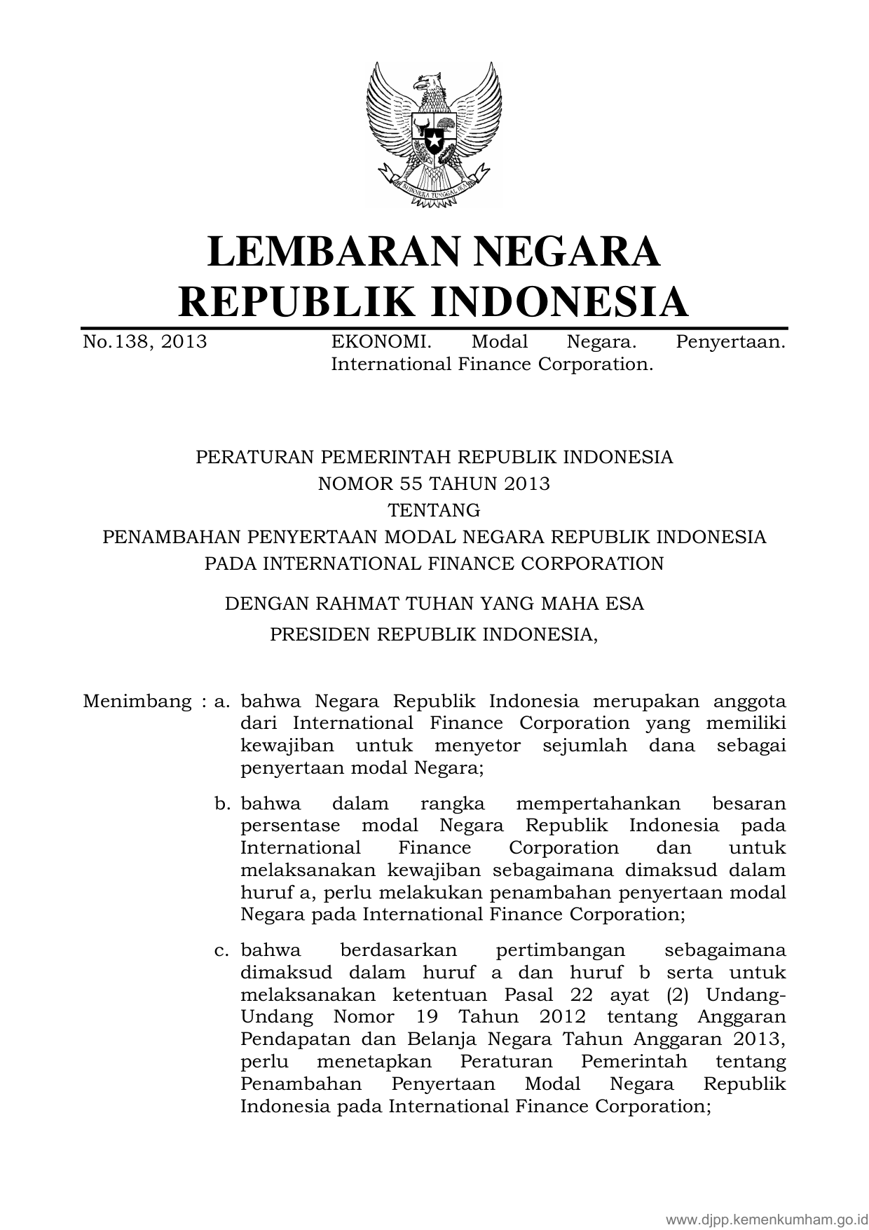 PP Nomor 55 Tahun 2013 | Peraturan Pemerintah Nomor 55 Tahun 2013 tentang PENAMBAHAN PENYERTAAN MODAL NEGARA REPUBLIK INDONESIA PADA INTERNATIONAL FINANCE CORPORATION