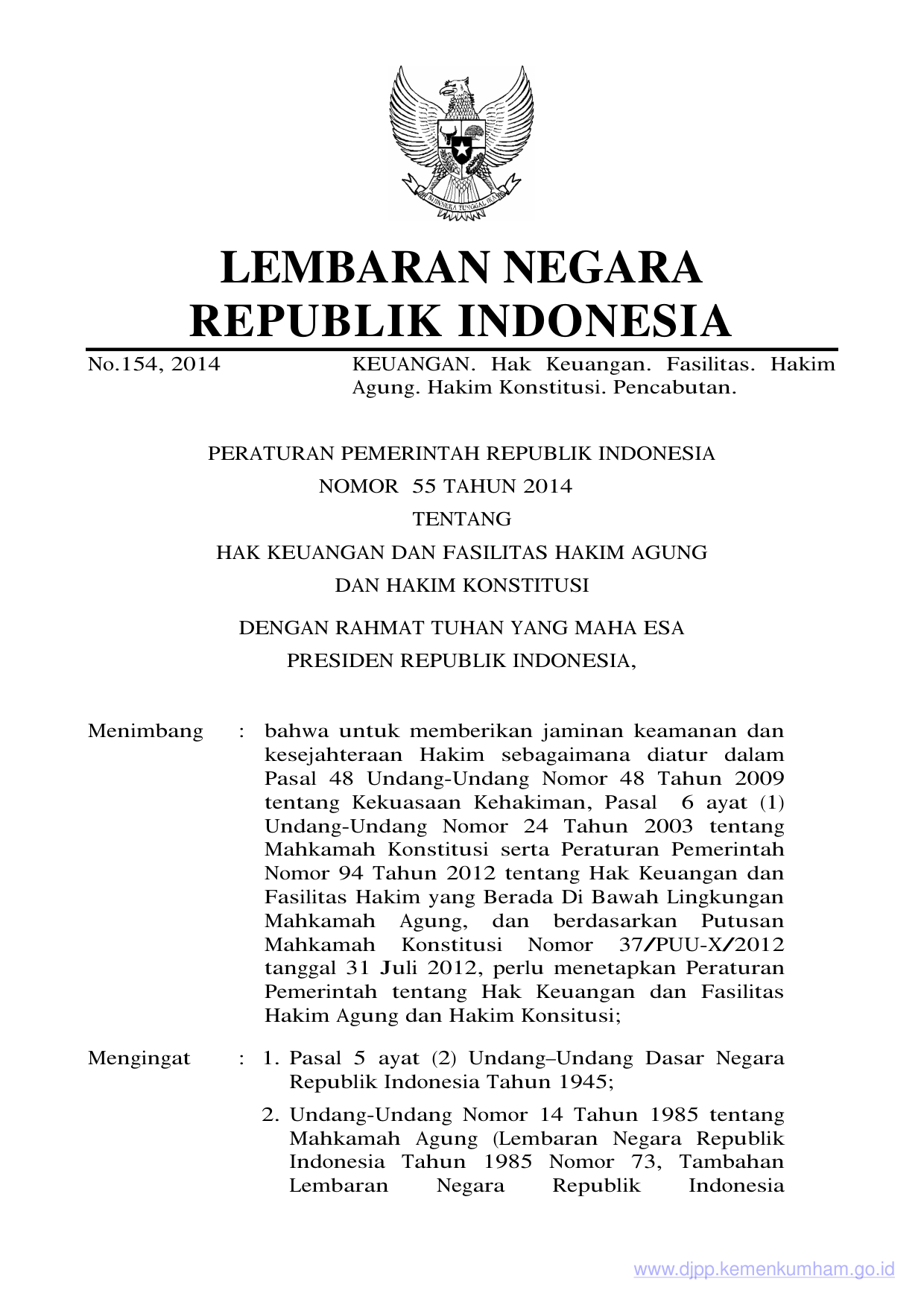 PP Nomor 55 Tahun 2014 | Peraturan Pemerintah Nomor 55 Tahun 2014 tentang HAK KEUANGAN DAN FASILITAS HAKIM AGUNG DAN HAKIM KONSTITUSI