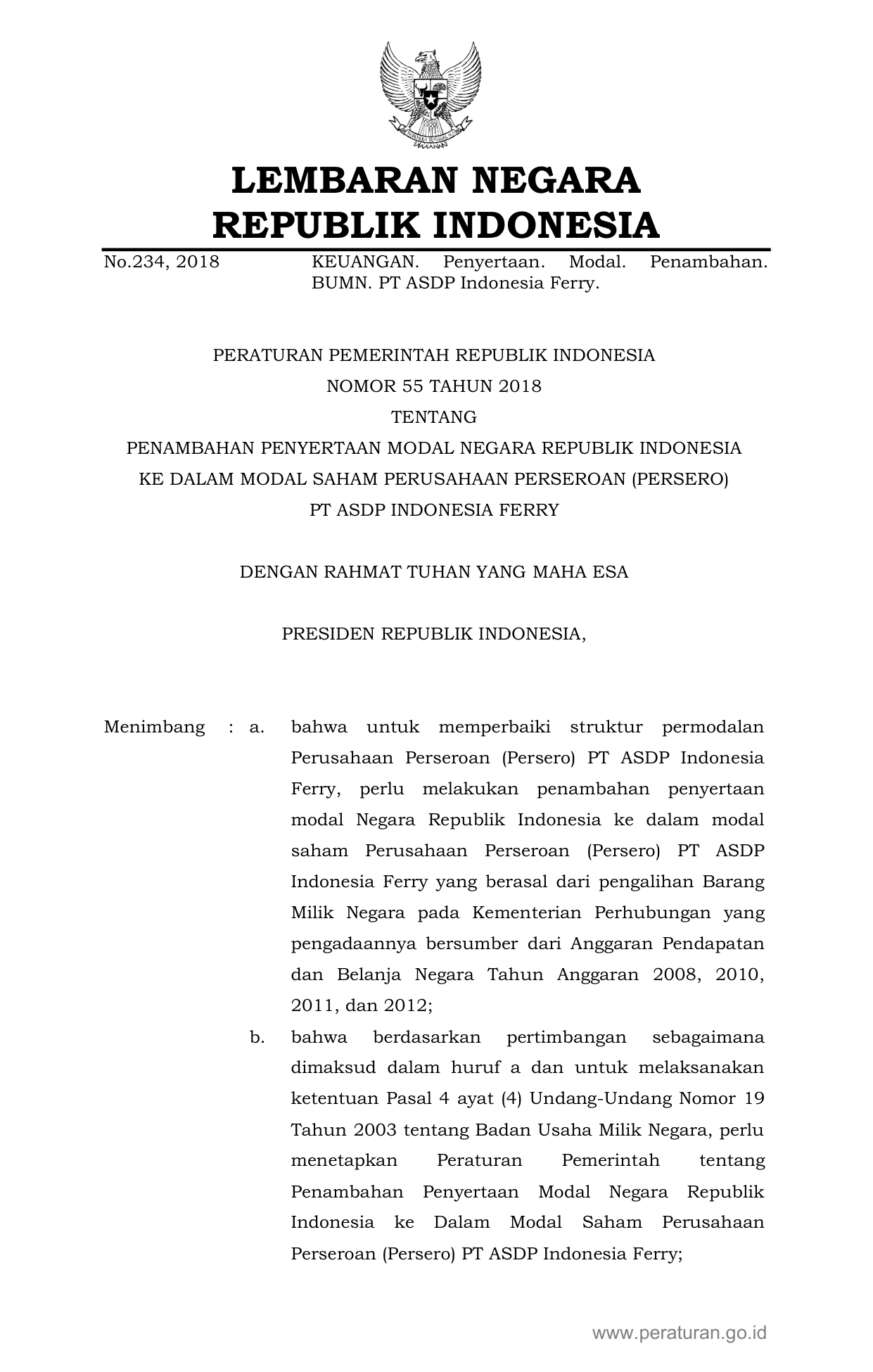 PP Nomor 55 Tahun 2018 | Peraturan Pemerintah Nomor 55 Tahun 2018 tentang Penambahan Penyertaan Modal Negara Republik Indonesia ke Dalam Modal Saham Perusahaan Perseroan (Persero) PT ASDP Indonesia Ferry