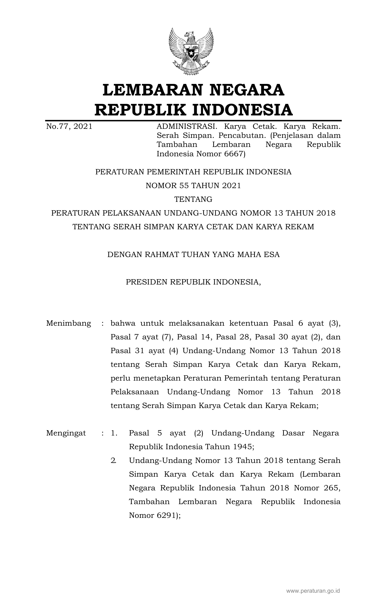 PP Nomor 55 Tahun 2021 | Peraturan Pemerintah Nomor 55 Tahun 2021 tentang PERATURAN PELAKSANAAN UNDANG-UNDANG NOMOR 13 TAHUN 2018 TENTANG SERAH SIMPAN KARYA CETAK DAN KARYA REKAM