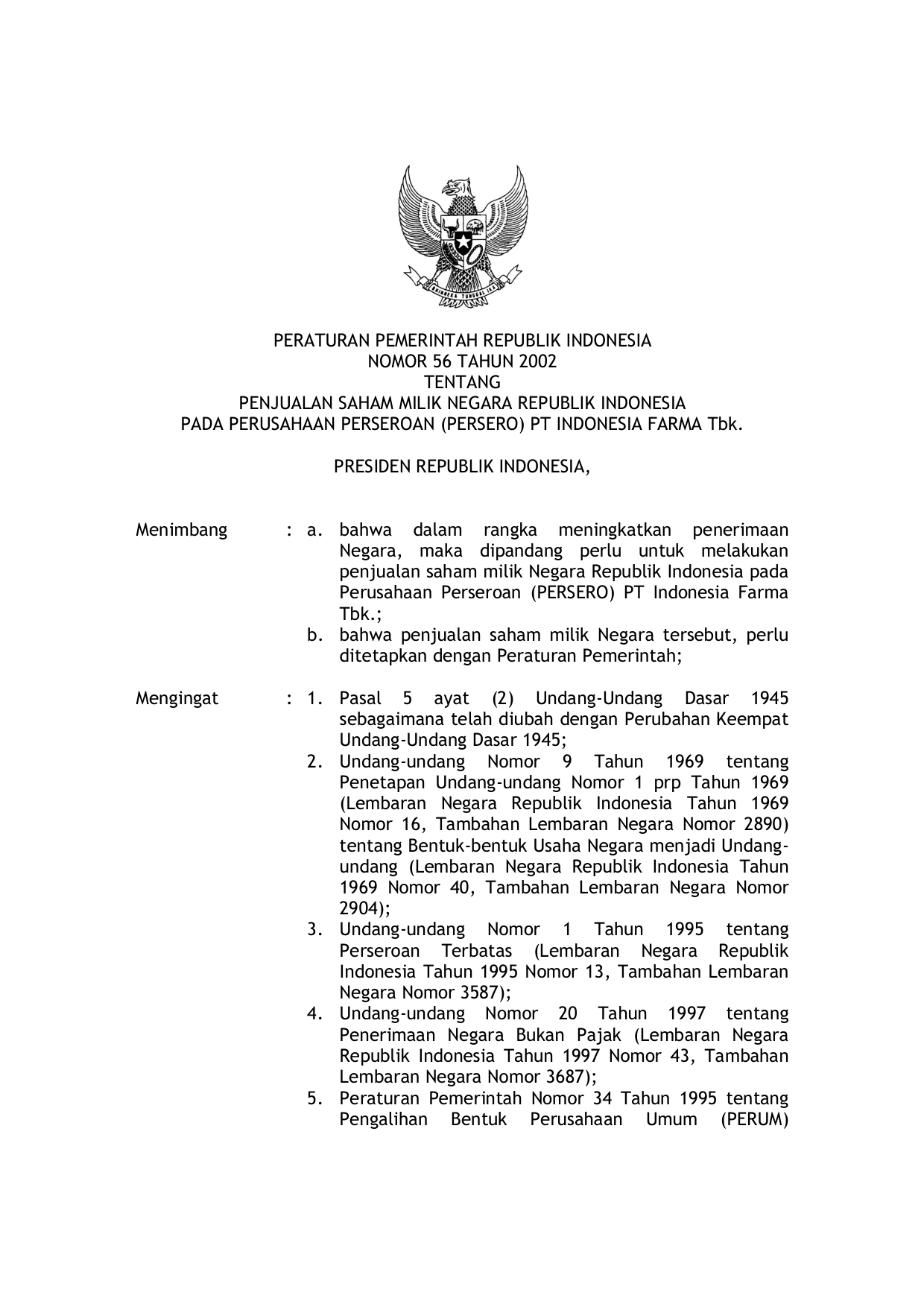 PP Nomor 56 Tahun 2002 | Peraturan Pemerintah Nomor 56 Tahun 2002 tentang PENJUALAN SAHAM MILIK NEGARA RI PADA PERUSAHAAN PERSEROAN (PERSERO) PT INDONESIA FARMA TBK