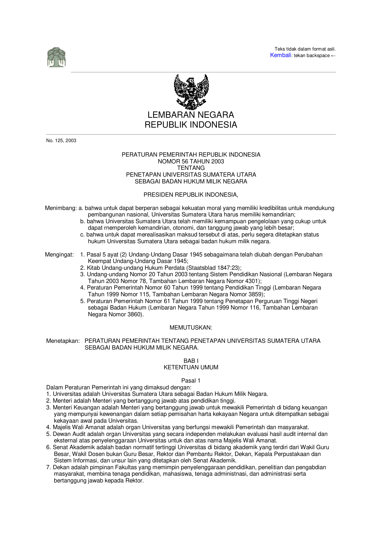 PP Nomor 56 Tahun 2003 | Peraturan Pemerintah Nomor 56 Tahun 2003 tentang PENETAPAN UNIVERSITAS SUMATERA UTARA SEBAGAI BADAN HUKUM MILIK NEGARA