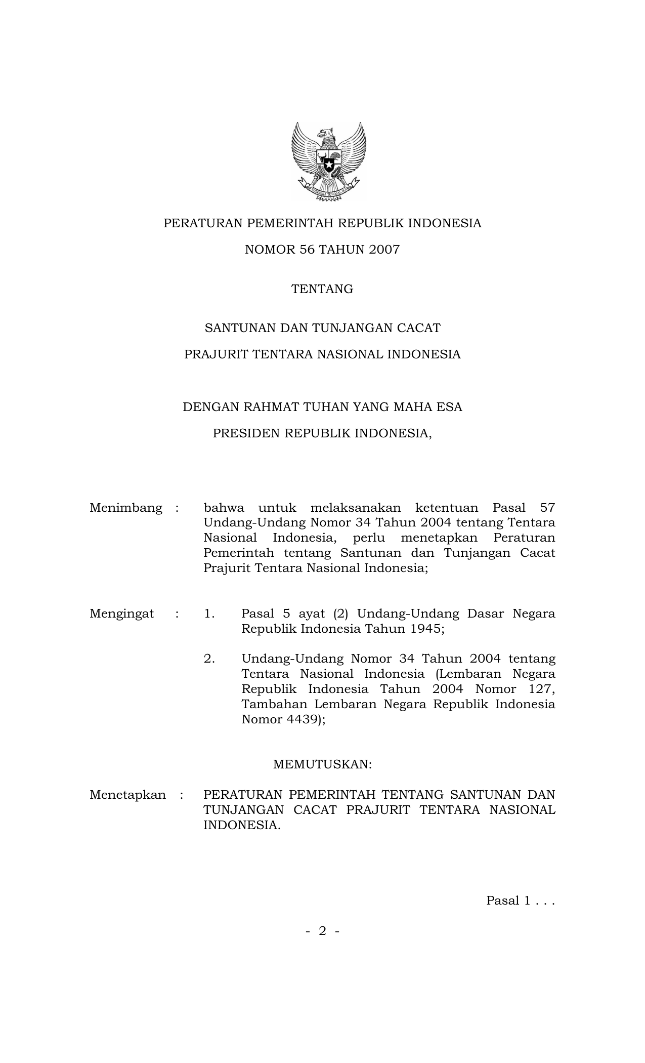PP Nomor 56 Tahun 2007 | Peraturan Pemerintah Nomor 56 Tahun 2007 tentang SANTUNAN DAN TUNJANGAN CACAT PRAJURIT TENTARA NASIONAL INDONESIA