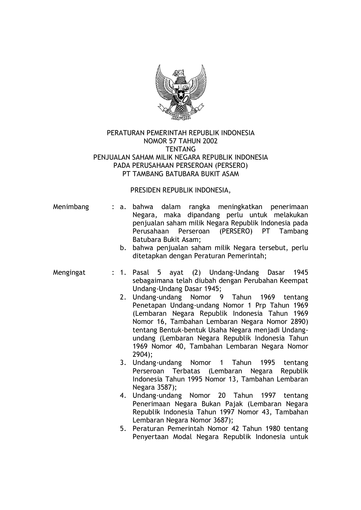PP Nomor 57 Tahun 2002 | Peraturan Pemerintah Nomor 57 Tahun 2002 tentang PENJUALAN SAHAM MILIK NEGARA RI PADA PERUSAHAAN PERSEROAN (PERSERO) PT TAMBANG BATUBARA BUKIT ASAM