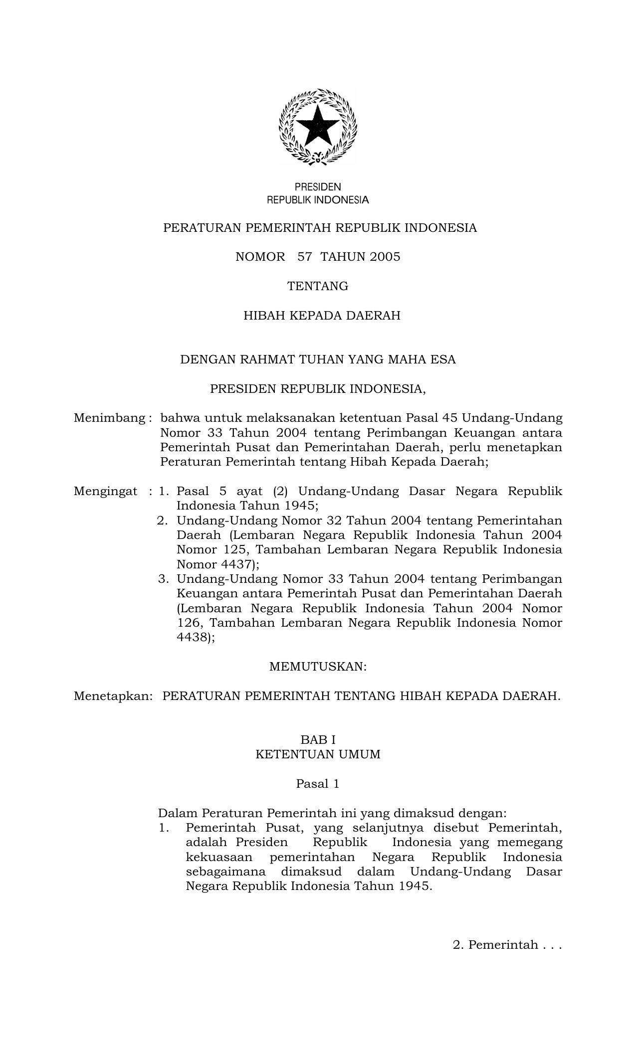PP Nomor 57 Tahun 2005 | Peraturan Pemerintah Nomor 57 Tahun 2005 tentang HIBAH KEPADA DAERAH
