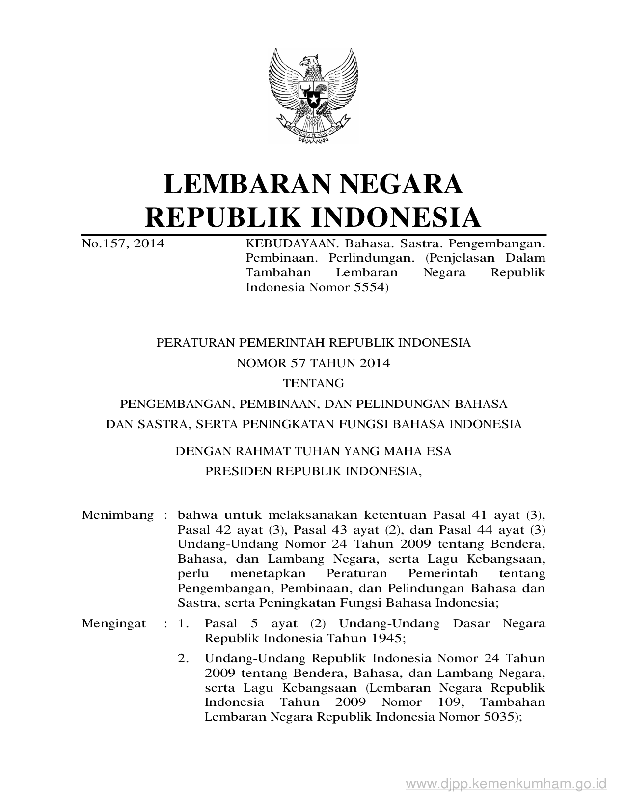 PP Nomor 57 Tahun 2014 | Peraturan Pemerintah Nomor 57 Tahun 2014 tentang PENGEMBANGAN, PEMBINAAN, DAN PELINDUNGAN BAHASA DAN SASTRA, SERTA PENINGKATAN FUNGSI BAHASA INDONESIA