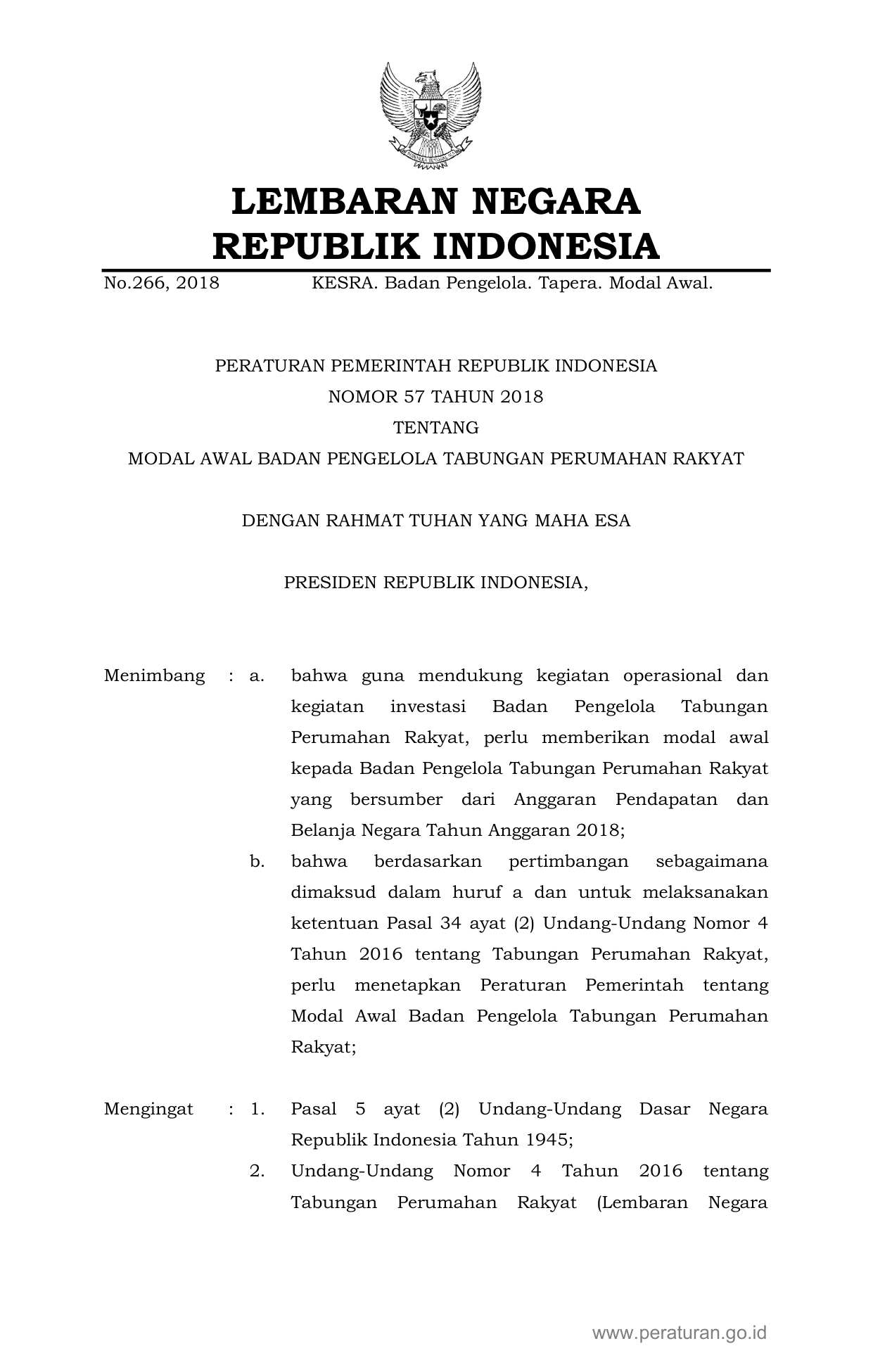 PP Nomor 57 Tahun 2018 | Peraturan Pemerintah Nomor 57 Tahun 2018 tentang Modal Awal Badan Pengelola Tabungan Perumahan Rakyat