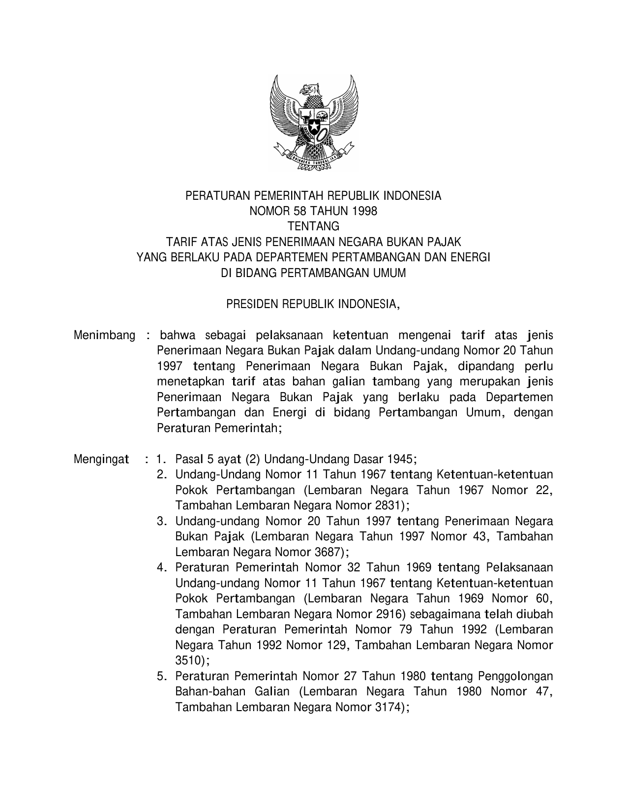 PP Nomor 58 Tahun 1998 | Peraturan Pemerintah Nomor 58 Tahun 1998 tentang TARIF ATAS JENIS PENERIMAAN NEGARA BUKAN PAJAK YANG BERLAKU PADA DEPARTEMEN PERTAMBANGAN DAN ENERGI DI BIDANG PERTAMBANGAN UMUM