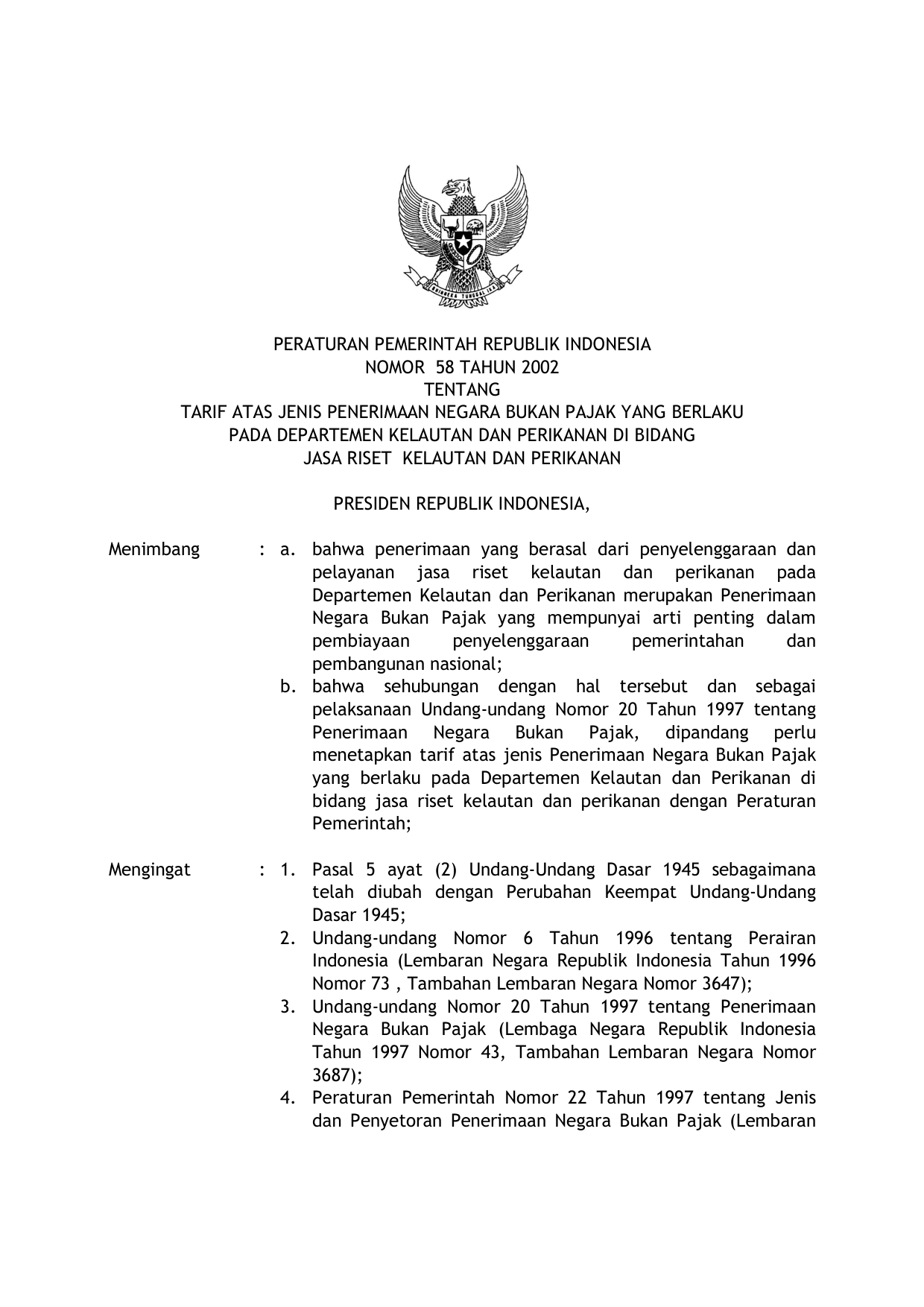 PP Nomor 58 Tahun 2002 | Peraturan Pemerintah Nomor 58 Tahun 2002 tentang TARIF ATAS JENIS PENERIMAAN NEGARA BUKAN PAJAK YANG BERLAKU PADA DEPARTEMEN KELAUTAN DAN PERIKANAN DI BIDANG JASA RISET KELAUTAN DAN PERIKANAN