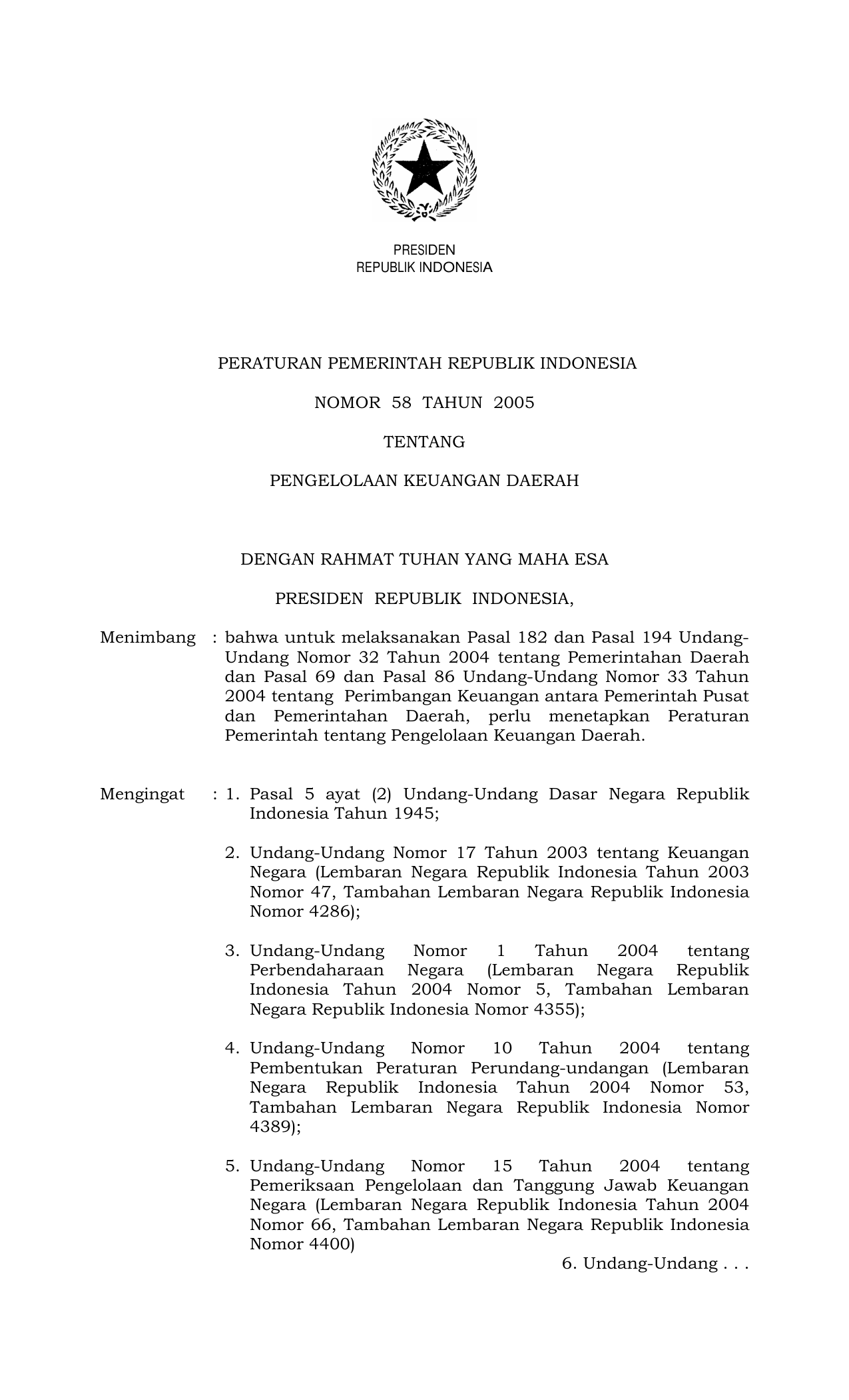 PP Nomor 58 Tahun 2005 | Peraturan Pemerintah Nomor 58 Tahun 2005 tentang PENGELOLAAN KEUANGAN DAERAH