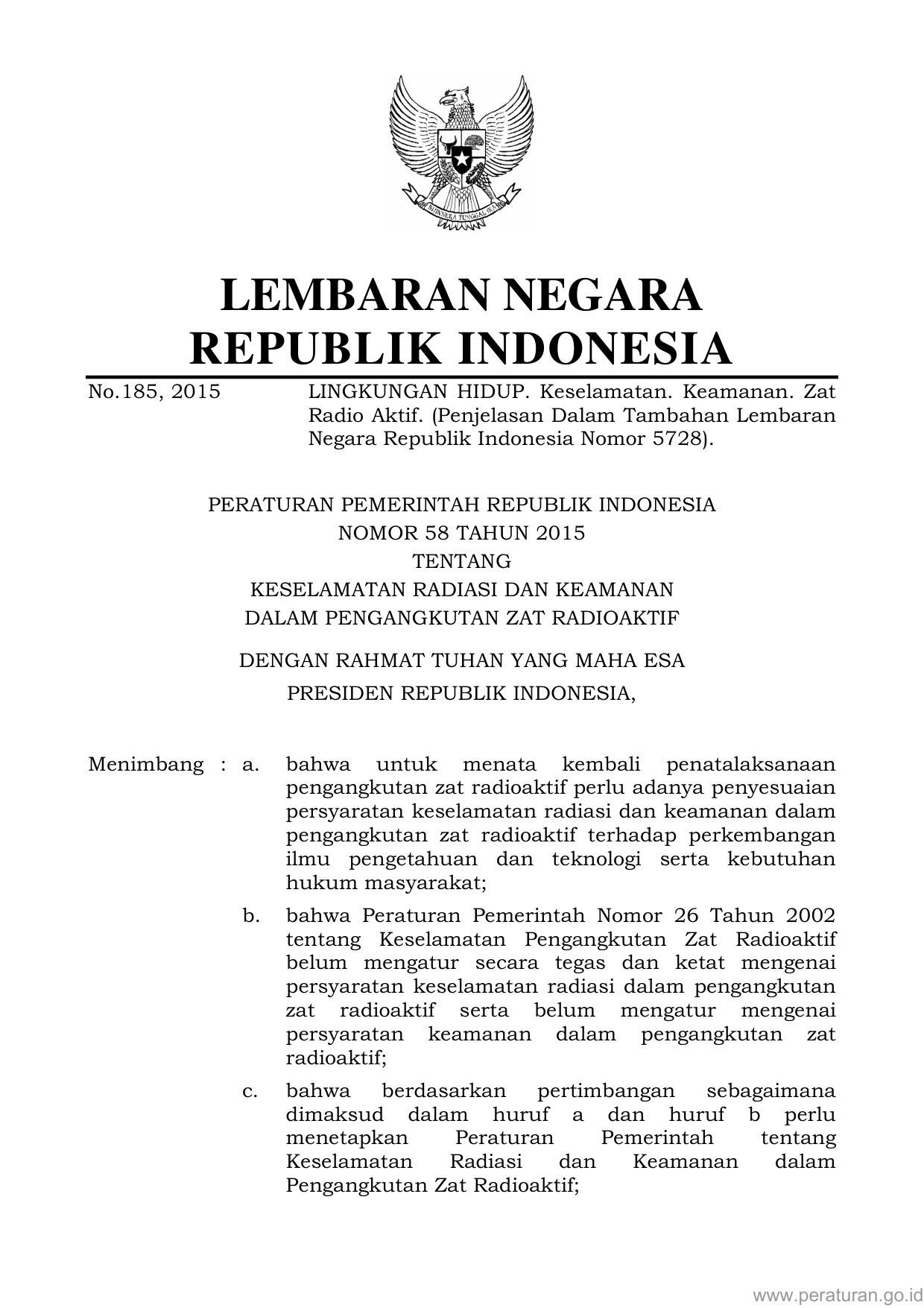 PP Nomor 58 Tahun 2015 | Peraturan Pemerintah Nomor 58 Tahun 2015 tentang KESELAMATAN RADIASI DAN KEAMANAN DALAM PENGANGKUTAN ZAT RADIOAKTIF