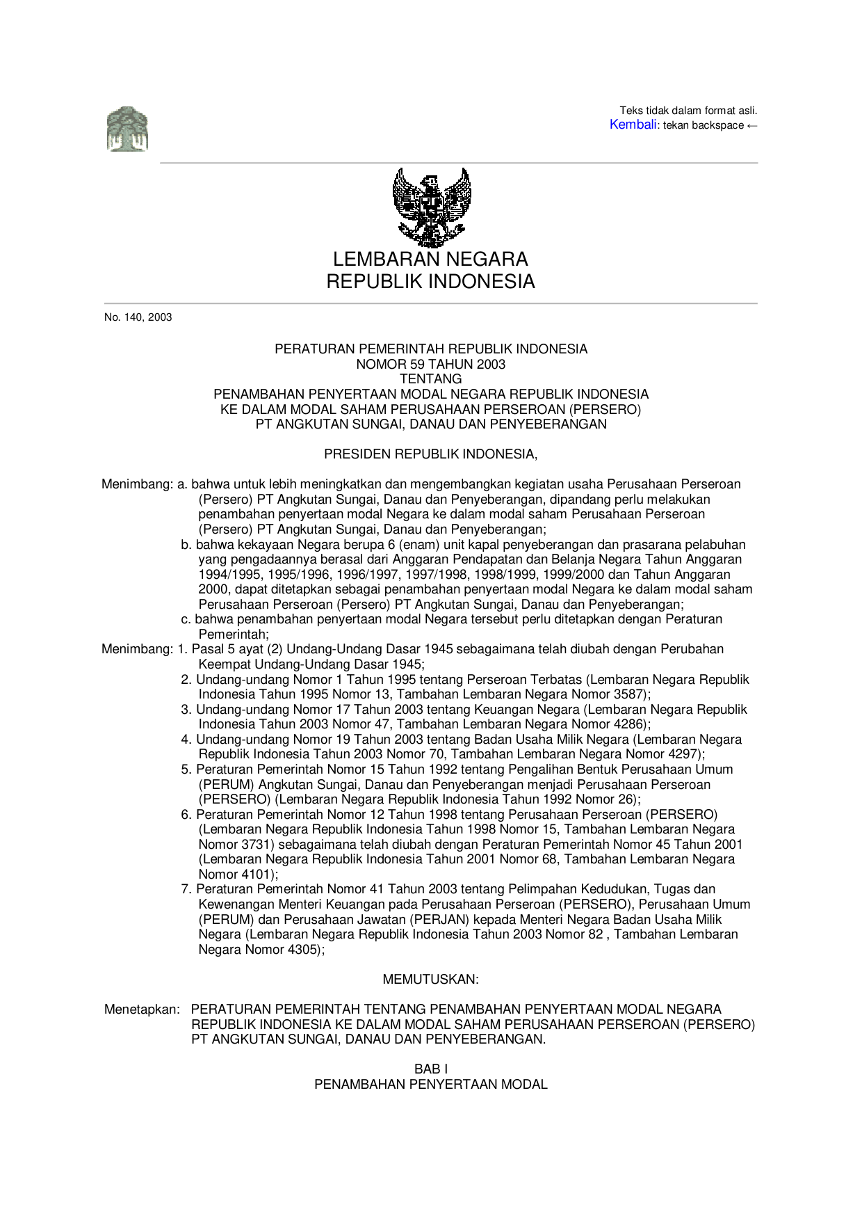 PP Nomor 59 Tahun 2003 | Peraturan Pemerintah Nomor 59 Tahun 2003 tentang PENAMBAHAN PENYERTAAN MODAL NEGARA RI KE DALAM MODAL SAHAM PERUSAHAAN PERSEROAN (PERSERO) PT ANGKUTAN SUNGAI, DANAU DAN PENYEBERANGAN