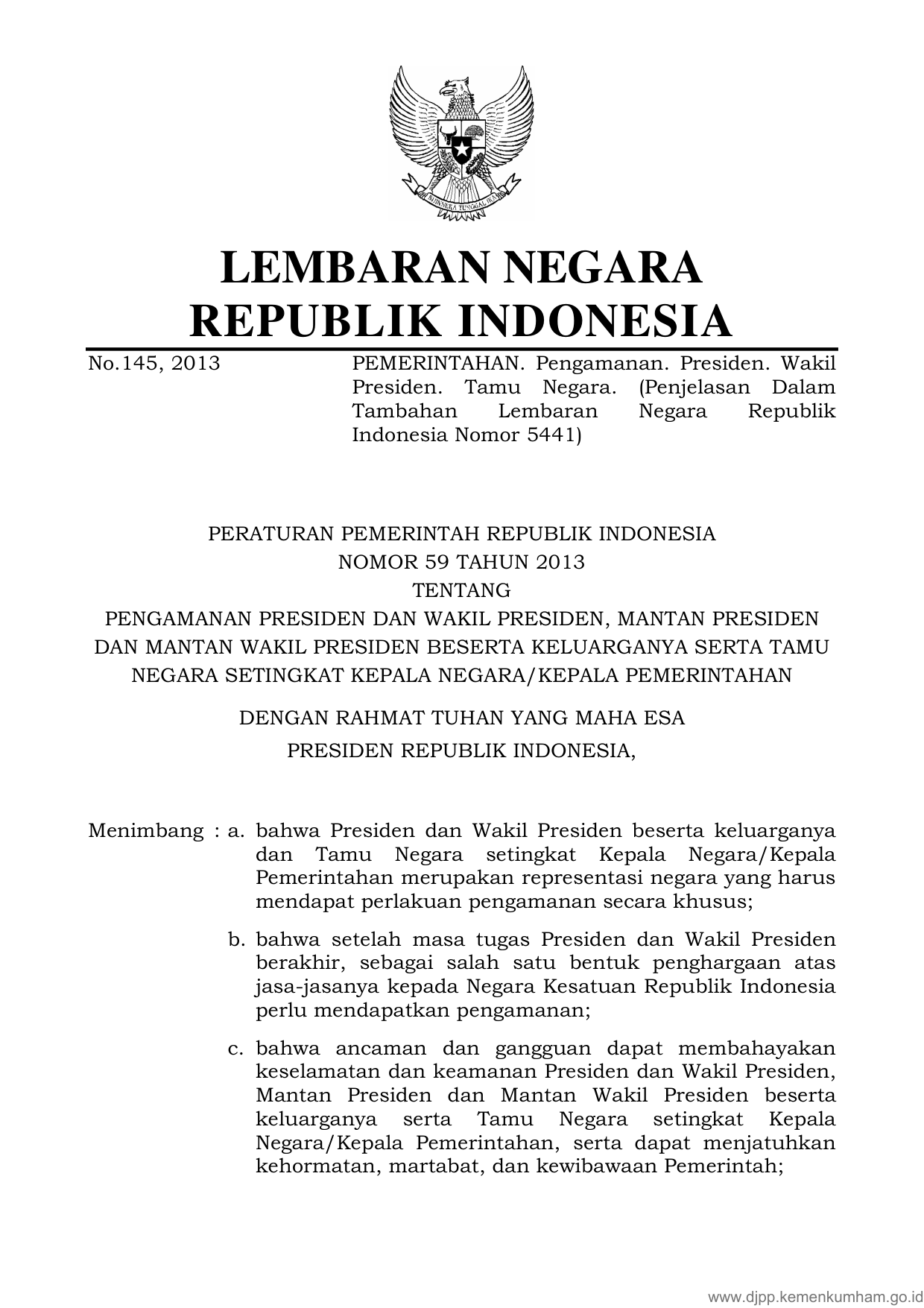 PP Nomor 59 Tahun 2013 | Peraturan Pemerintah Nomor 59 Tahun 2013 tentang PENGAMANAN PRESIDEN DAN WAKIL PRESIDEN, MANTAN PRESIDEN DAN MANTAN WAKIL PRESIDEN BESERTA KELUARGANYA SERTA TAMU NEGARA SETINGKAT KEPALA NEGARA/KEPALA PEMERINTAHAN