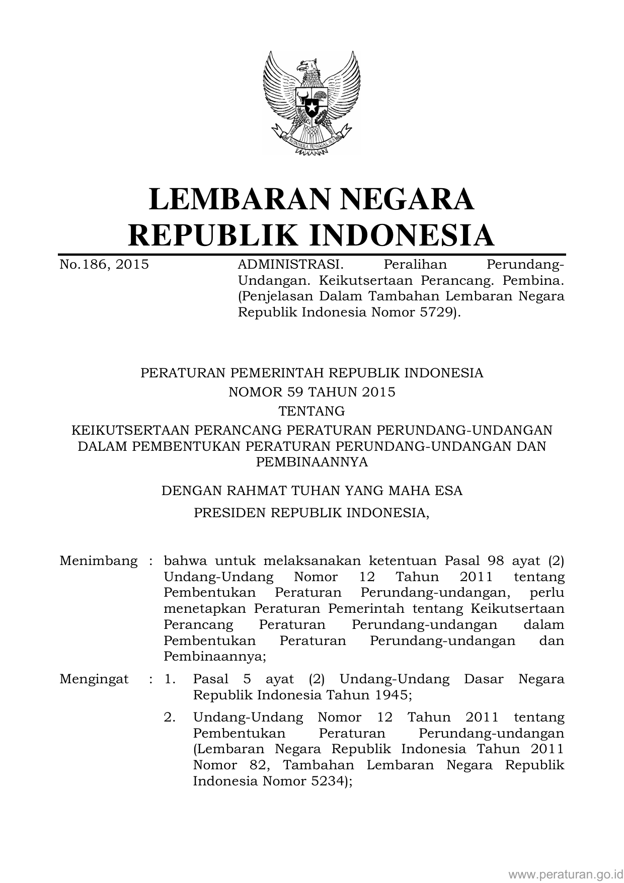 PP Nomor 59 Tahun 2015 | Peraturan Pemerintah Nomor 59 Tahun 2015 tentang KEIKUTSERTAAN PERANCANG PERATURAN PERUNDANG-UNDANGAN DALAM PEMBENTUKAN PERATURAN PERUNDANG-UNDANGAN DAN PEMBINAANNYA