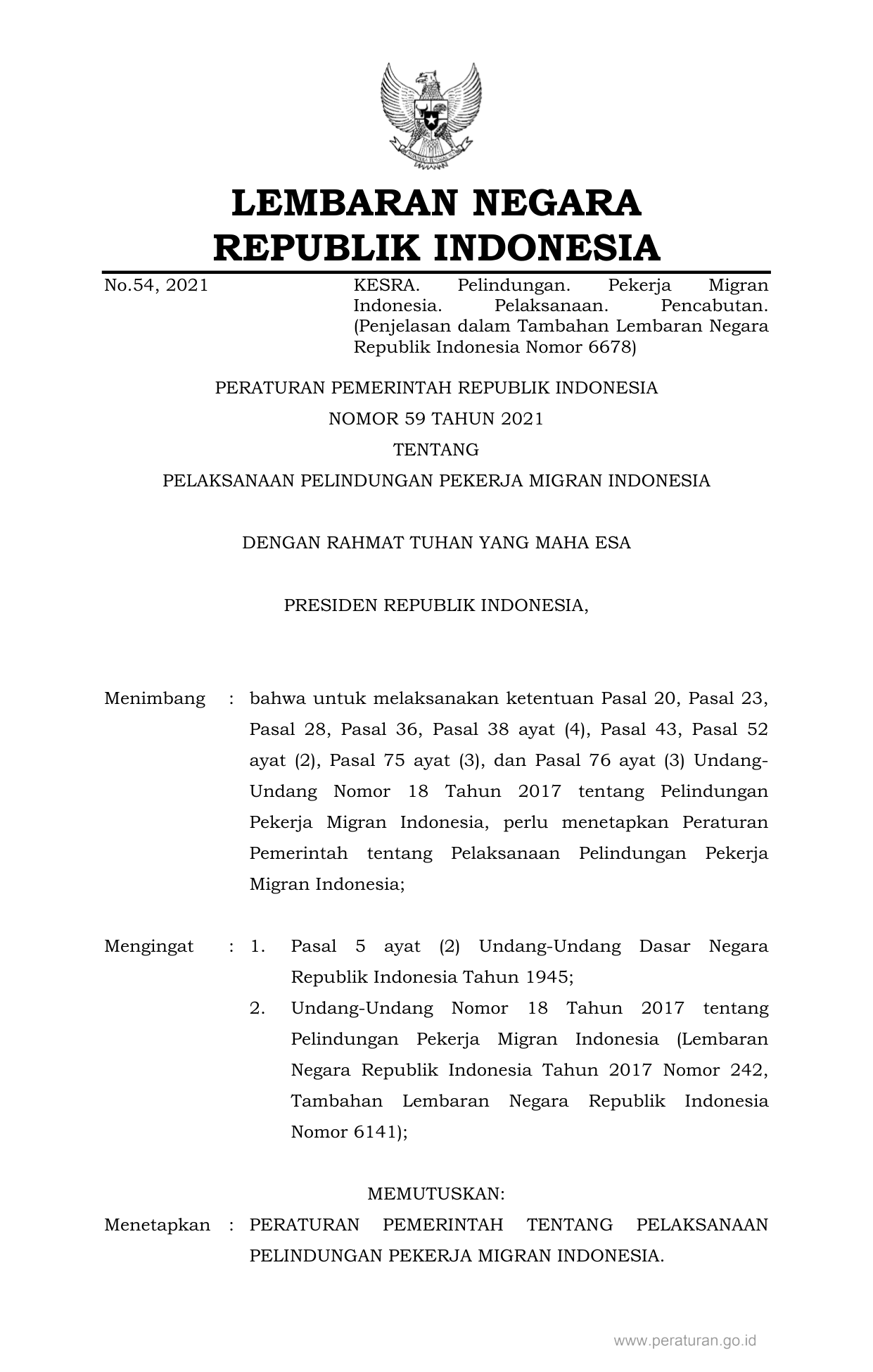PP Nomor 59 Tahun 2021 | Peraturan Pemerintah Nomor 59 Tahun 2021 tentang PELAKSANAAN PELINDUNGAN PEKERJA MIGRAN INDONESIA