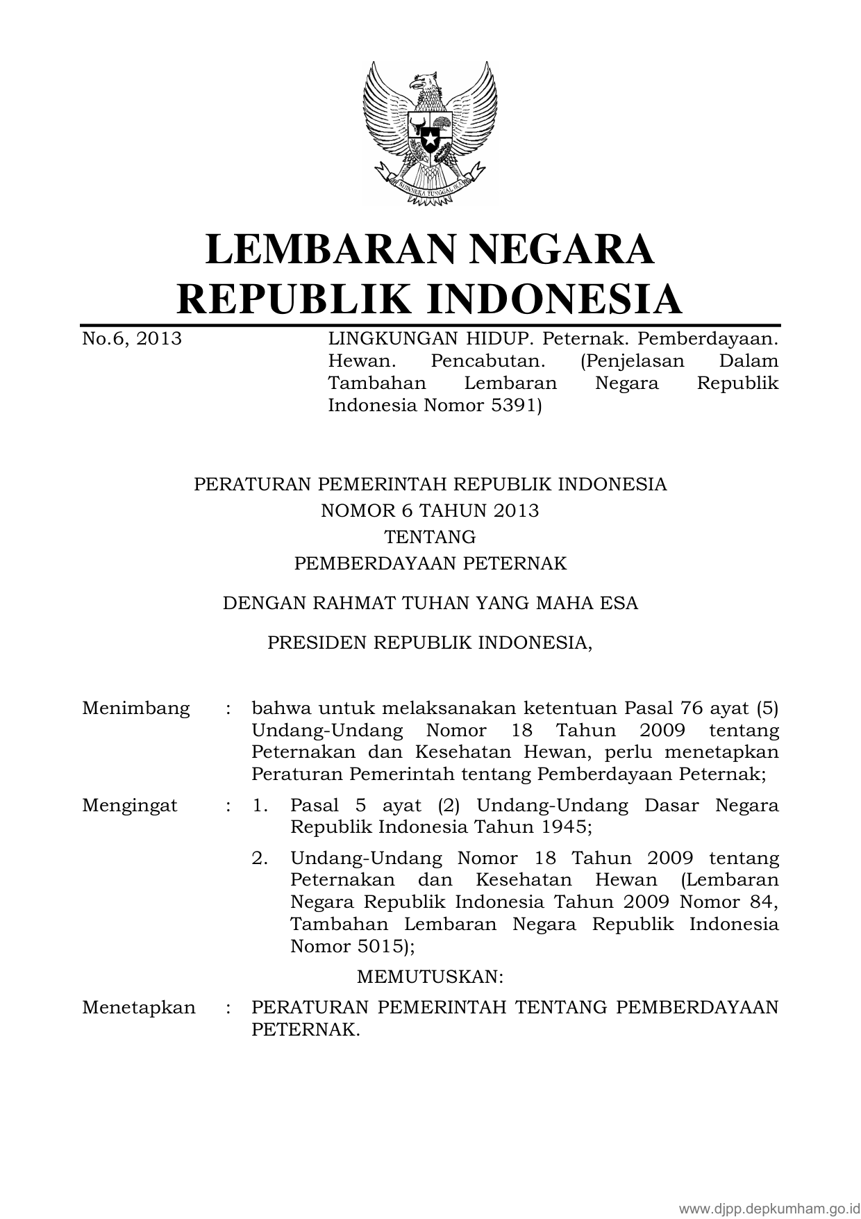 PP Nomor 6 Tahun 2013 | Peraturan Pemerintah Nomor 6 Tahun 2013 tentang PEMBERDAYAAN PETERNAK