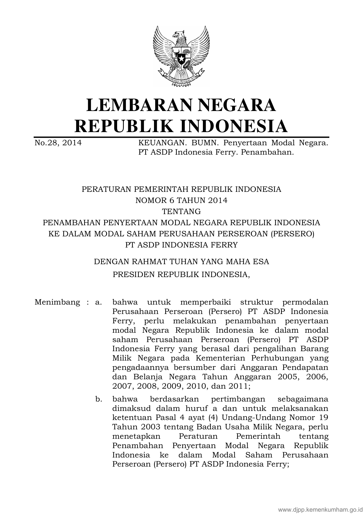PP Nomor 6 Tahun 2014 | Peraturan Pemerintah Nomor 6 Tahun 2014 tentang PENAMBAHAN PENYERTAAN MODAL NEGARA REPUBLIK INDONESIA KE DALAM MODAL SAHAM PERUSAHAAN PERSEROAN (PERSERO) PT ASDP INDONESIA FERRY