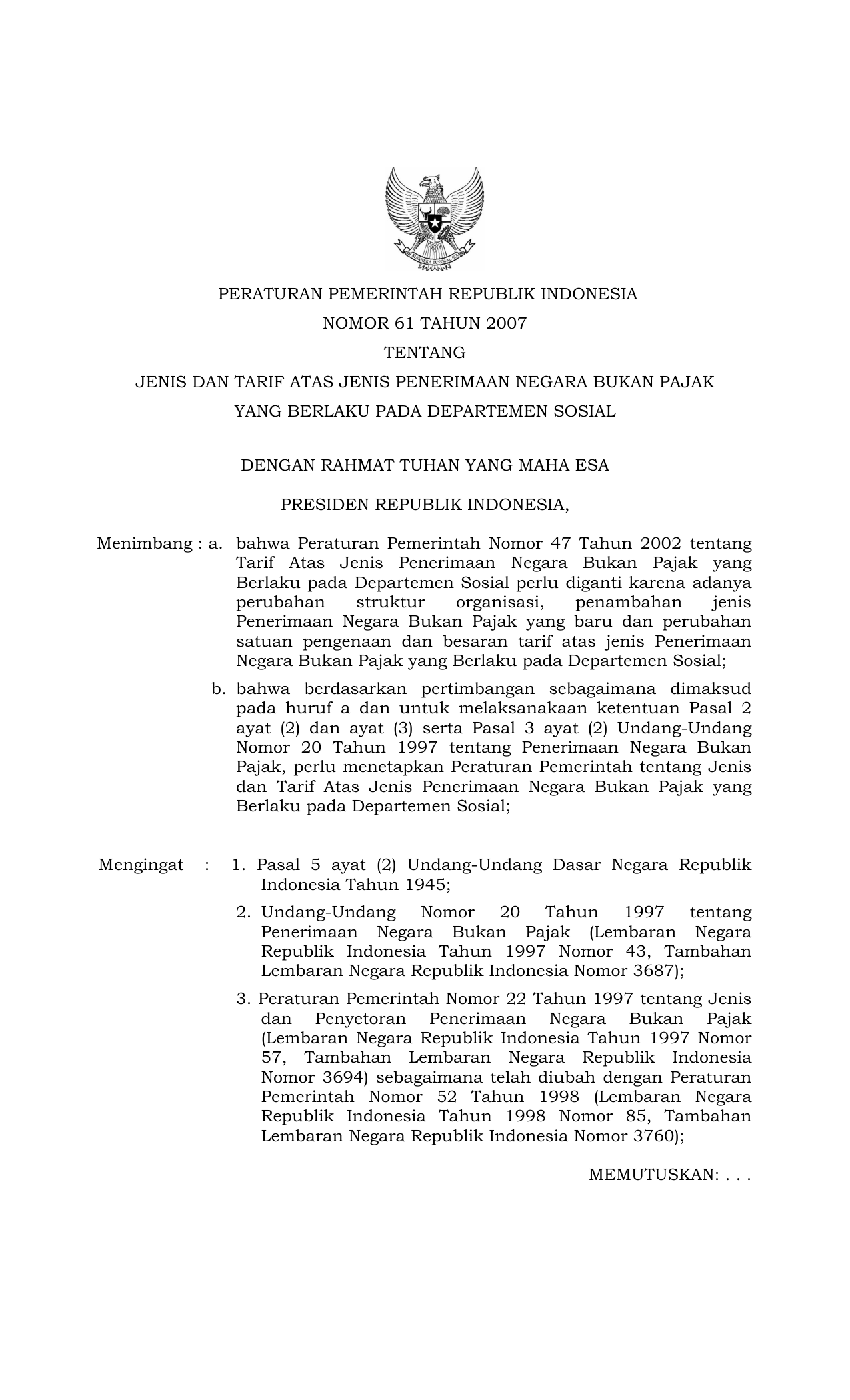 PP Nomor 61 Tahun 2007 | Peraturan Pemerintah Nomor 61 Tahun 2007 tentang JENIS DAN TARIF PENERIMAAN NEGARA BUKAN PAJAK YANG BERLAKU DI DEPARTEMEN SOSIAL
