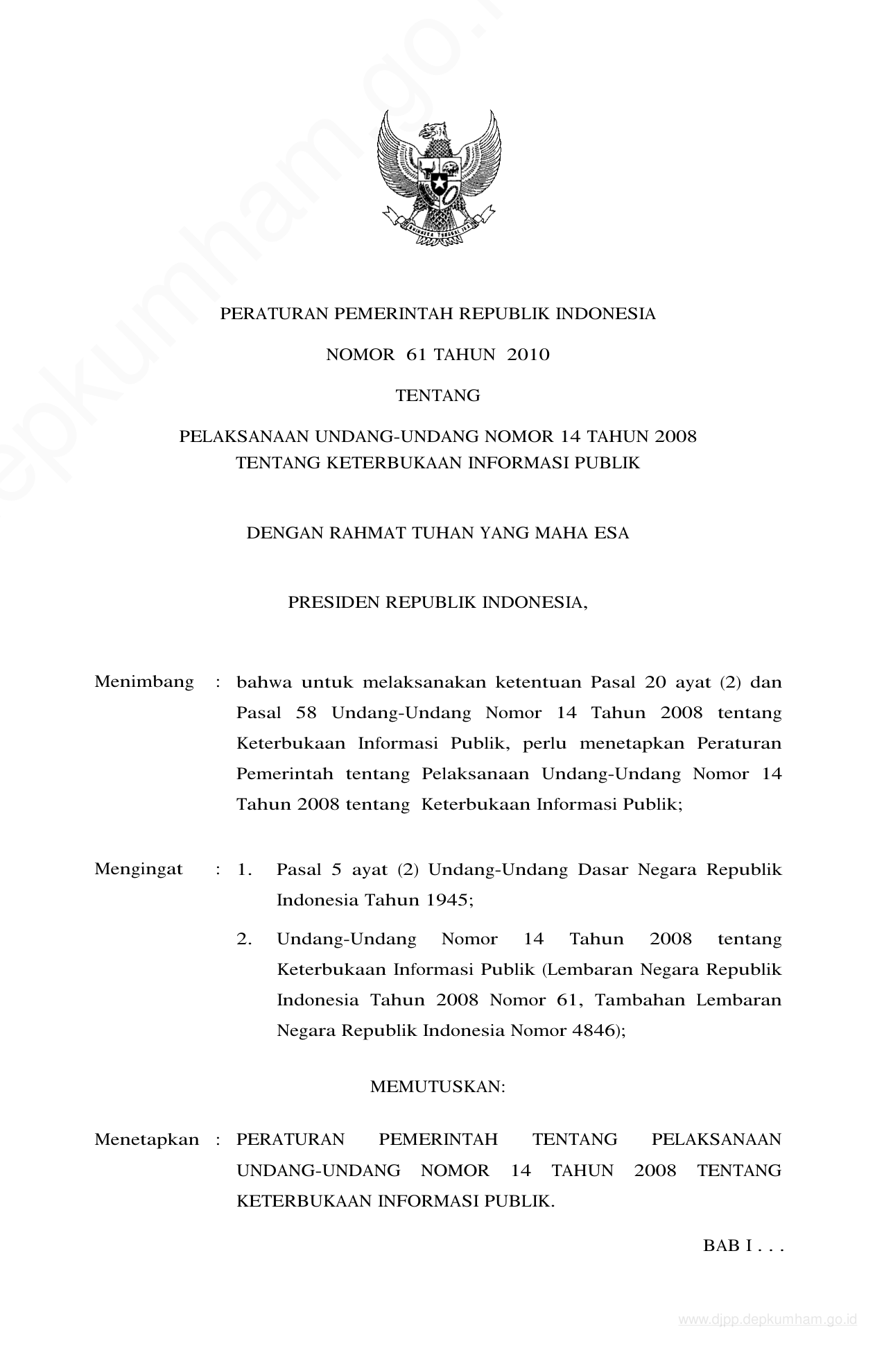 PP Nomor 61 Tahun 2010 | Peraturan Pemerintah Nomor 61 Tahun 2010 tentang PELAKSANAAN UNDANG-UNDANG NOMOR 14 TAHUN 2008 TENTANG KETERBUKAAN INFORMASI PUBLIK