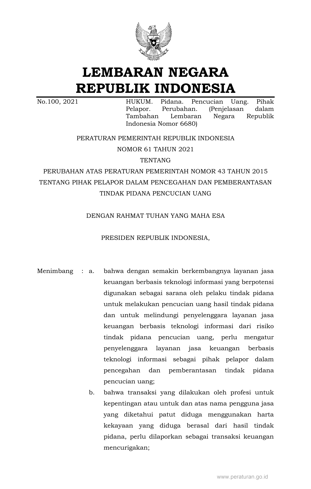 PP Nomor 61 Tahun 2021 | Peraturan Pemerintah Nomor 61 Tahun 2021 tentang PERUBAHAN ATAS PERATURAN PEMERINTAH NOMOR 43 TAHUN 2015 TENTANG PIHAK PELAPOR DALAM PENCEGAHAN DAN PEMBERANTASAN TINDAK PIDANA PENCUCIAN UANG