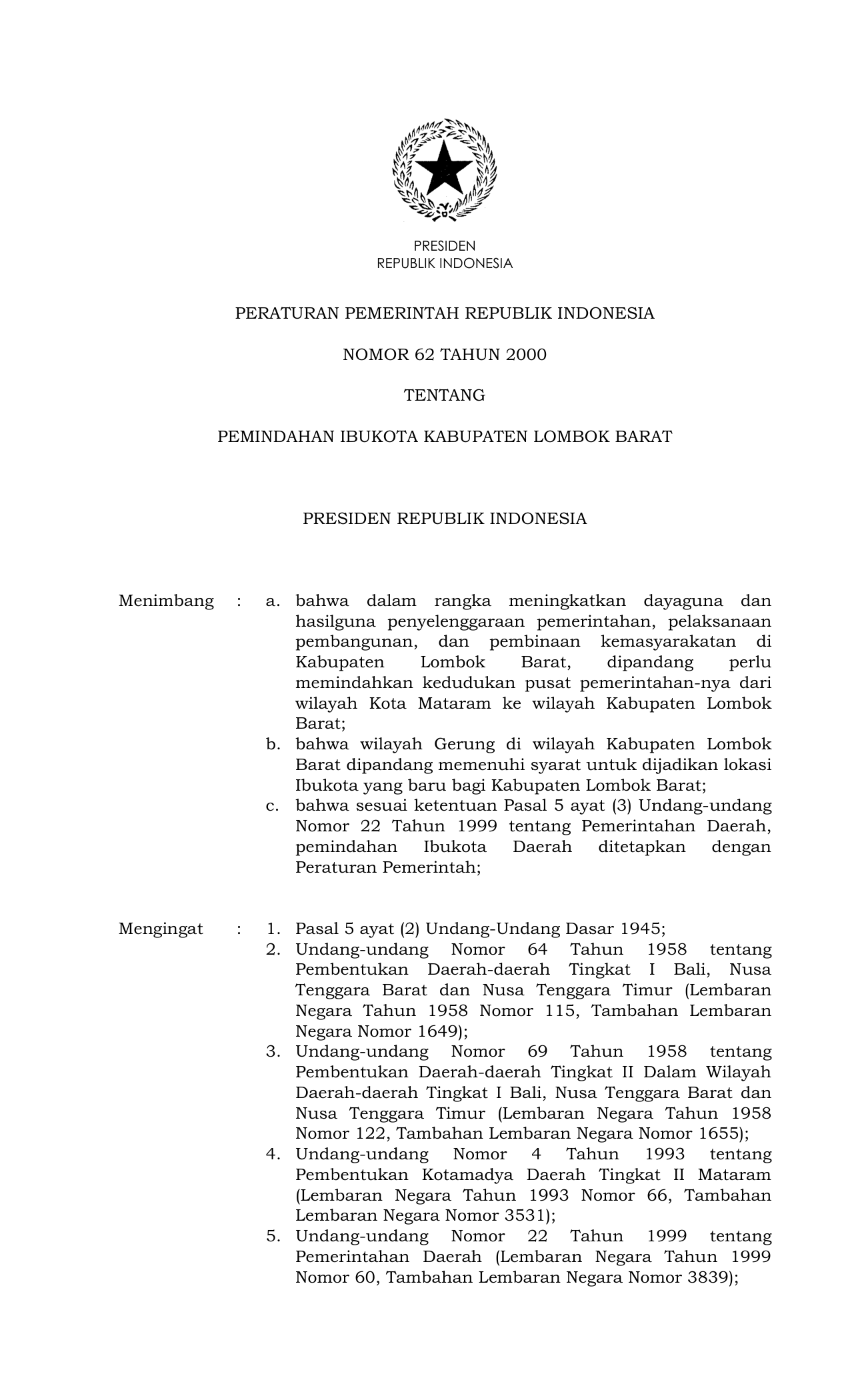 PP Nomor 62 Tahun 2000 | Peraturan Pemerintah Nomor 62 Tahun 2000 tentang PEMINDAHAN IBUKOTA KABUPATEN LOMBOK BARAT