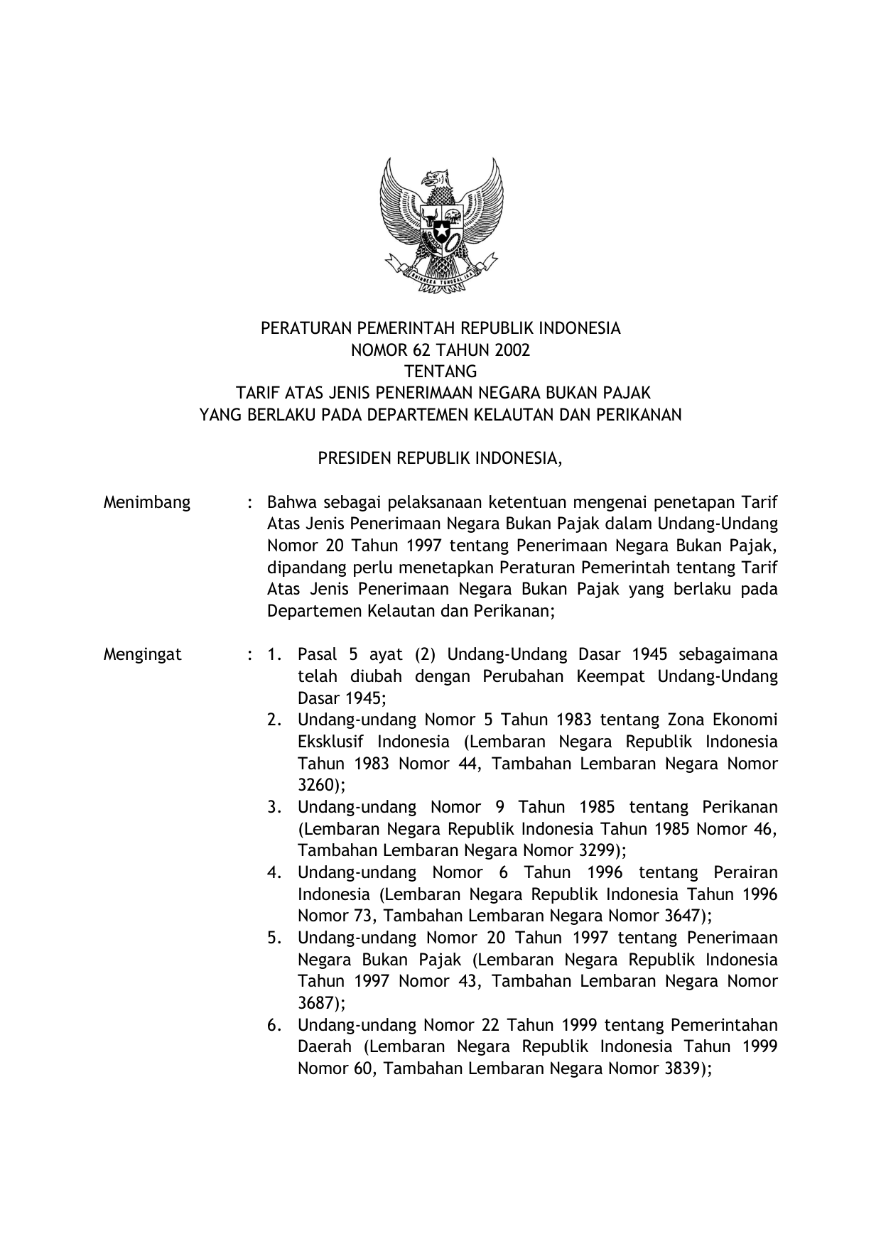 PP Nomor 62 Tahun 2002 | Peraturan Pemerintah Nomor 62 Tahun 2002 tentang TARIF ATAS JENIS PENERIMAAN NEGARA BUKAN PAJAK YANG BERLAKU PADA DEPARTEMEN KELAUTAN DAN PERIKANAN