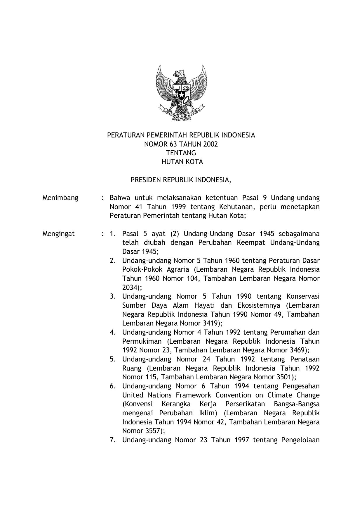 PP Nomor 63 Tahun 2002 | Peraturan Pemerintah Nomor 63 Tahun 2002 tentang HUTAN KOTA