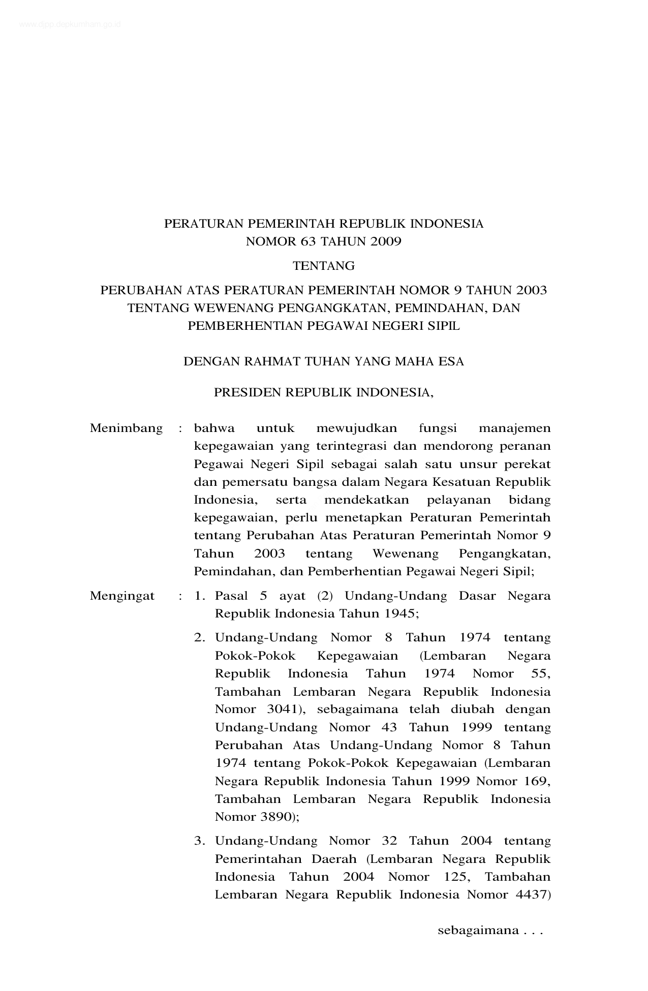 PP Nomor 63 Tahun 2009 | Peraturan Pemerintah Nomor 63 Tahun 2009 tentang PERUBAHAN ATAS PERATURAN PEMERINTAH NOMOR 9 TAHUN 2003 TENTANG WEWENANG PENGANGKUTAN, PEMINDAHAN, DAN PEMBERHENTIAN PEGAWAI NEGERI SIPIL