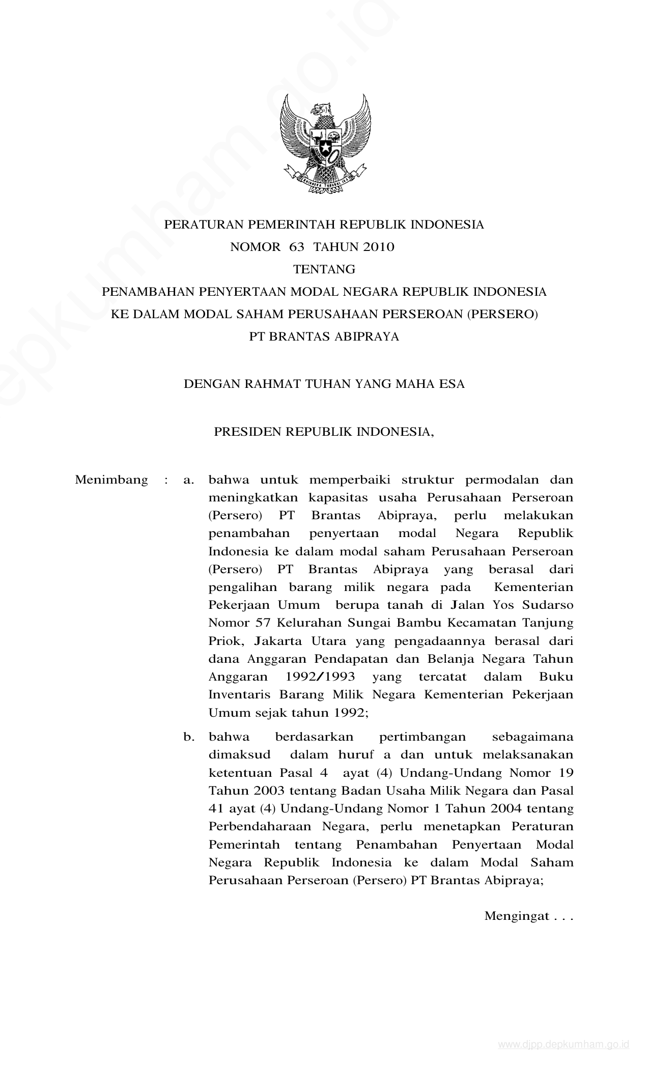 PP Nomor 63 Tahun 2010 | Peraturan Pemerintah Nomor 63 Tahun 2010 tentang PENAMBAHAN PENYERTAAN MODAL NEGARA REPUBLIK INDONESIA KE DALAM MODAL SAHAM PERUSAHAAN PERSEROAN (PERSERO) PT BRANTAS ABIPRAYA
