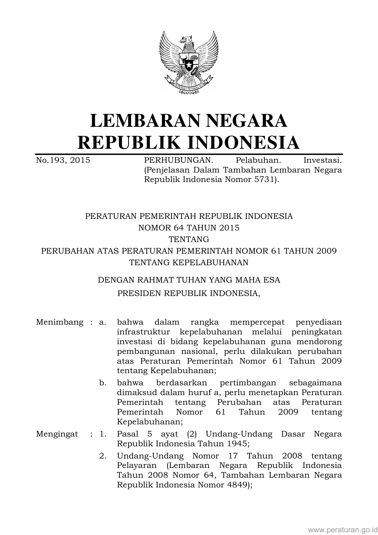 PP Nomor 64 Tahun 2015 | Peraturan Pemerintah Nomor 64 Tahun 2015 tentang PERUBAHAN ATAS PERATURAN PEMERINTAH NOMOR 61 TAHUN 2009 TENTANG KEPELABUHANAN