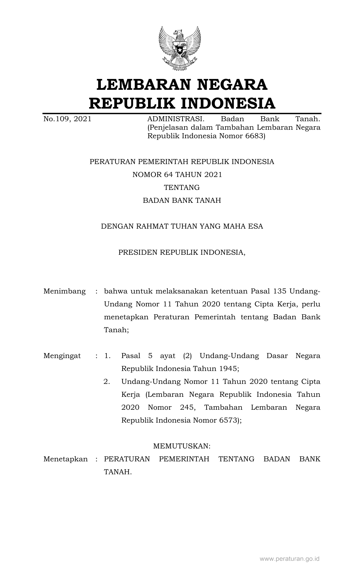 PP Nomor 64 Tahun 2021 | Peraturan Pemerintah Nomor 64 Tahun 2021 tentang BADAN BANK TANAH