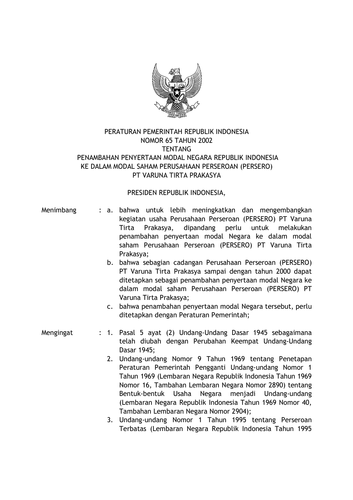 PP Nomor 65 Tahun 2002 | Peraturan Pemerintah Nomor 65 Tahun 2002 tentang PENAMBAHAN PENYERTAAN MODAL NEGARA RI KE DALAM MODAL SAHAM PERUSAHAAN PERSEROAN (PERSERO) PT VARUNA TIRTA PRAKASYA