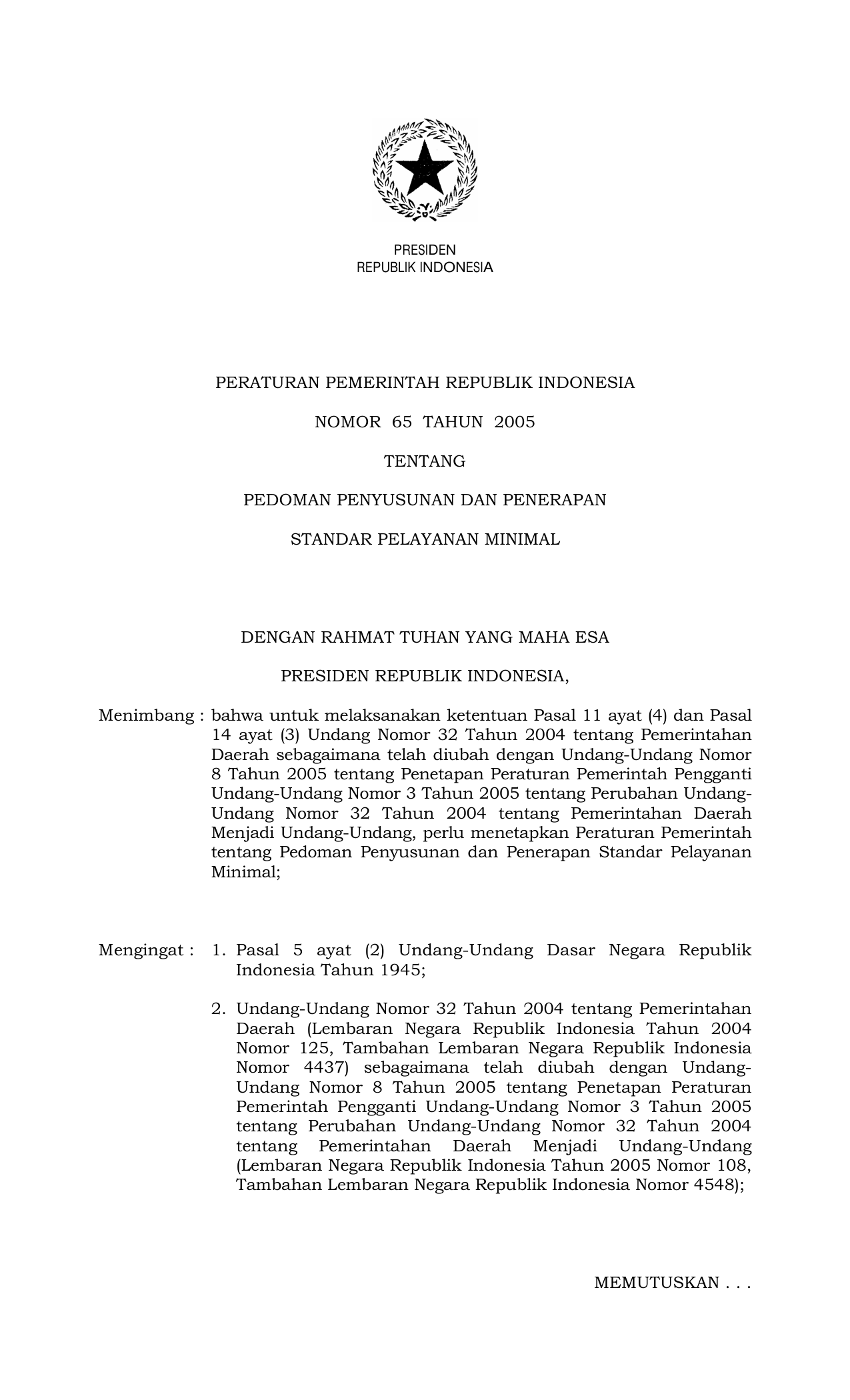 PP Nomor 65 Tahun 2005 | Peraturan Pemerintah Nomor 65 Tahun 2005 tentang PEDOMAN PENYUSUNAN DAN PENERAPAN STANDAR PELAYANAN MINIMAL