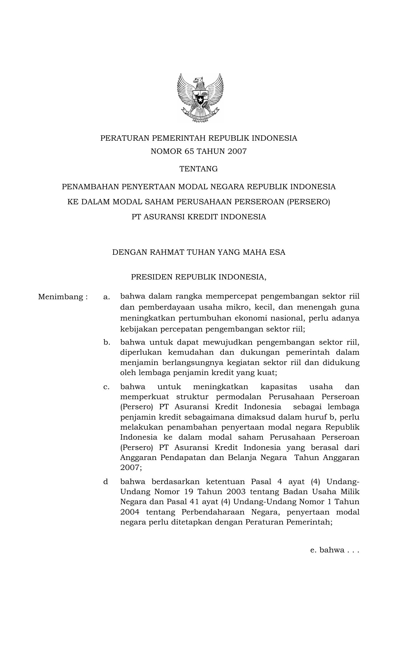 PP Nomor 65 Tahun 2007 | Peraturan Pemerintah Nomor 65 Tahun 2007 tentang PENAMBAHAN PENYERTAAN MODAL NEGARA RI KE DALAM MODAL SAHAM PERUSAHAAN PERSEROAN (PERSERO) PT ASURANSI KREDIT INDONESIA