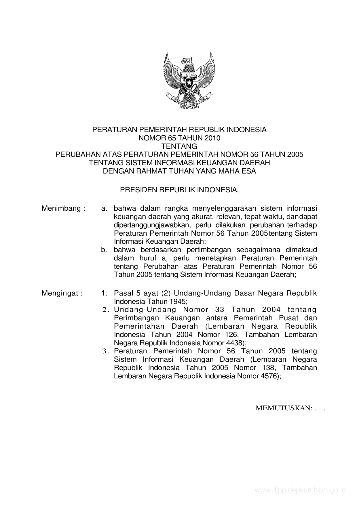 PP Nomor 65 Tahun 2010 | Peraturan Pemerintah Nomor 65 Tahun 2010 tentang PERUBAHAN ATAS PERATURAN PEMERINTAH NOMOR 56 TAHUN 2005 TENTANG SISTEM INFORMASI KEUANGAN DAERAH