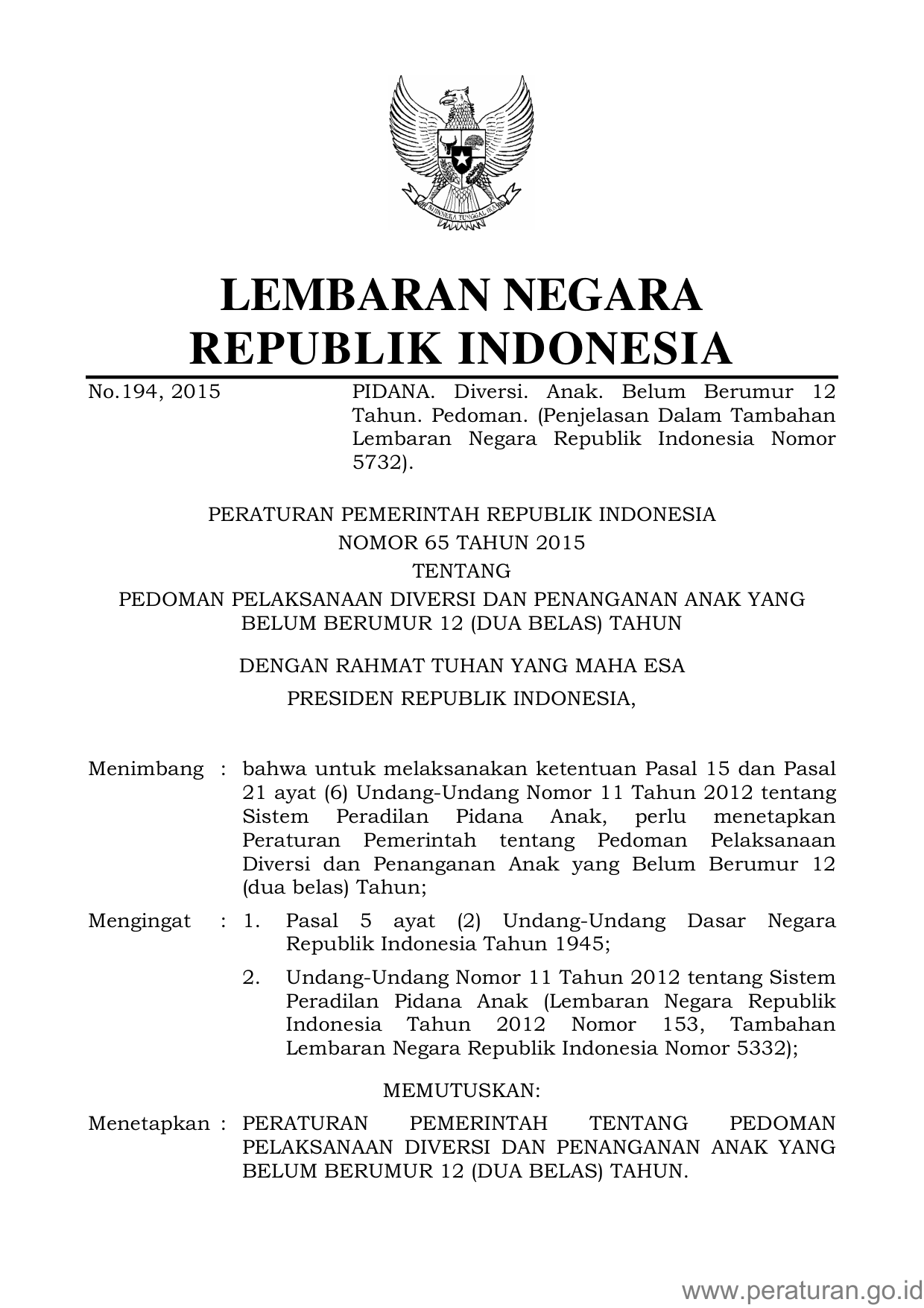 PP Nomor 65 Tahun 2015 | Peraturan Pemerintah Nomor 65 Tahun 2015 tentang PEDOMAN PELAKSANAAN DIVERSI DAN PENANGANAN ANAK YANG BELUM BERUMUR 12 (DUA BELAS) TAHUN