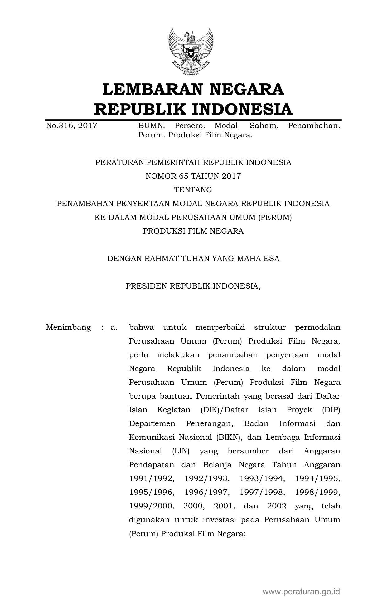 PP Nomor 65 Tahun 2017 | Peraturan Pemerintah Nomor 65 Tahun 2017 tentang Penambahan Penyertaan Modal Negara Republik Indonesia ke Dalam Modal Perusahaan Umum (Perum) Produksi Film Negara